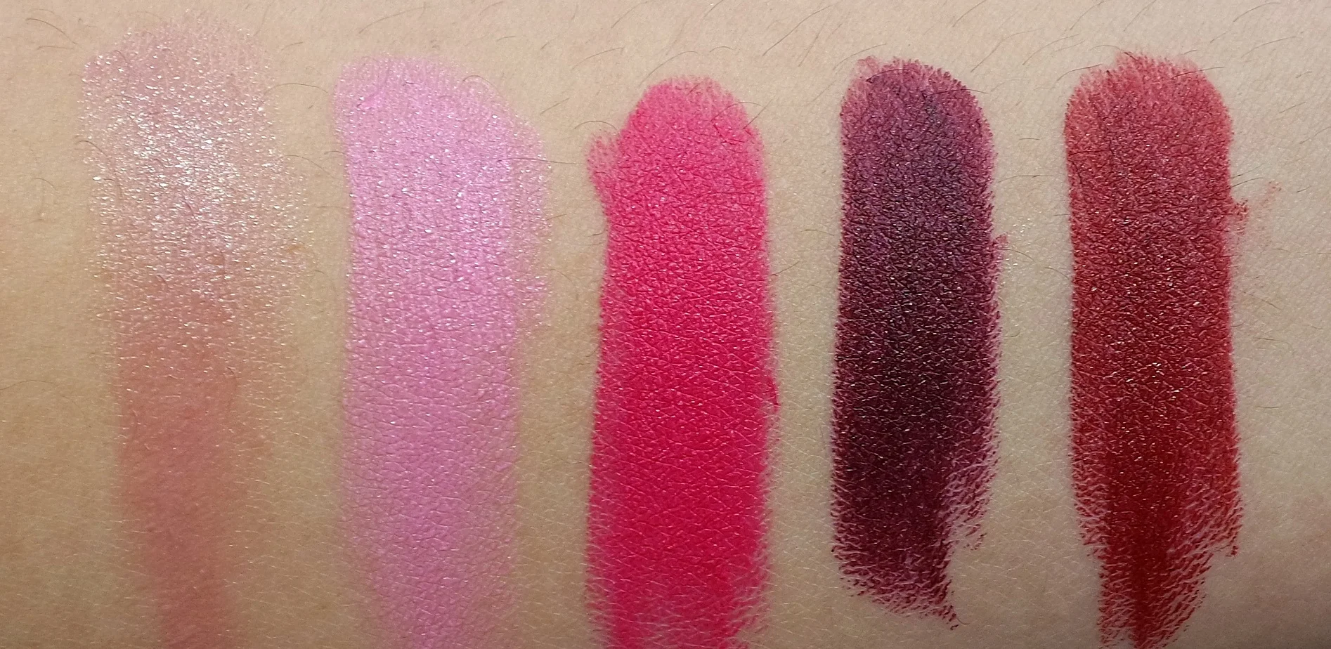 Lipsticks: Myself (soft shimmery nude beige), Yield To Love (mid-tone rose), Good Kisser (mid-tone fuchsia), Lingering Kiss (deep plum red), Hearts Aflame (mid-tone brick red)
