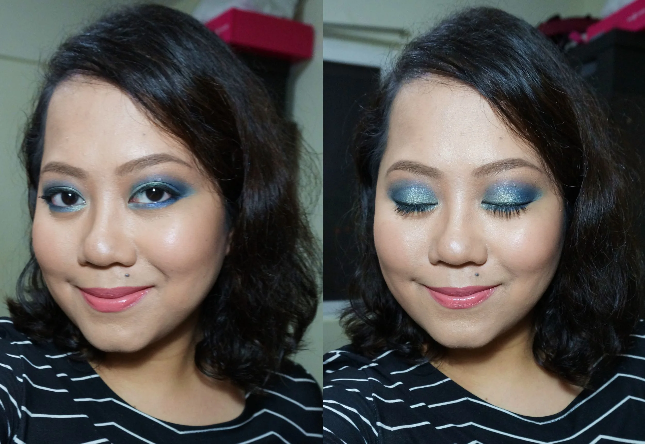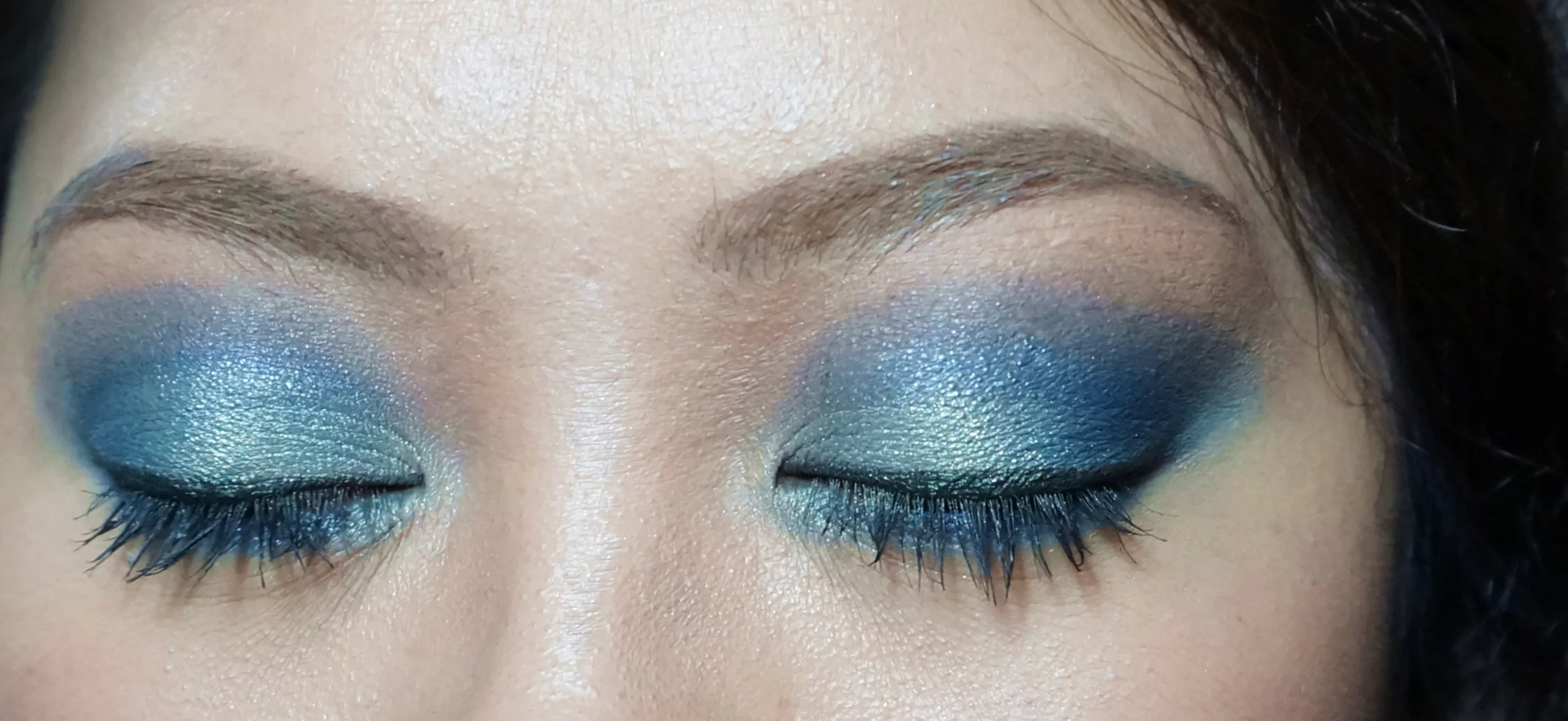 I used the shimmery teal on the lids, the deep shimmery blue on the outer-v, and then the matte navy blue on the crease. I blended out the crease makeup with a tan color since I don't want any obvious lines.