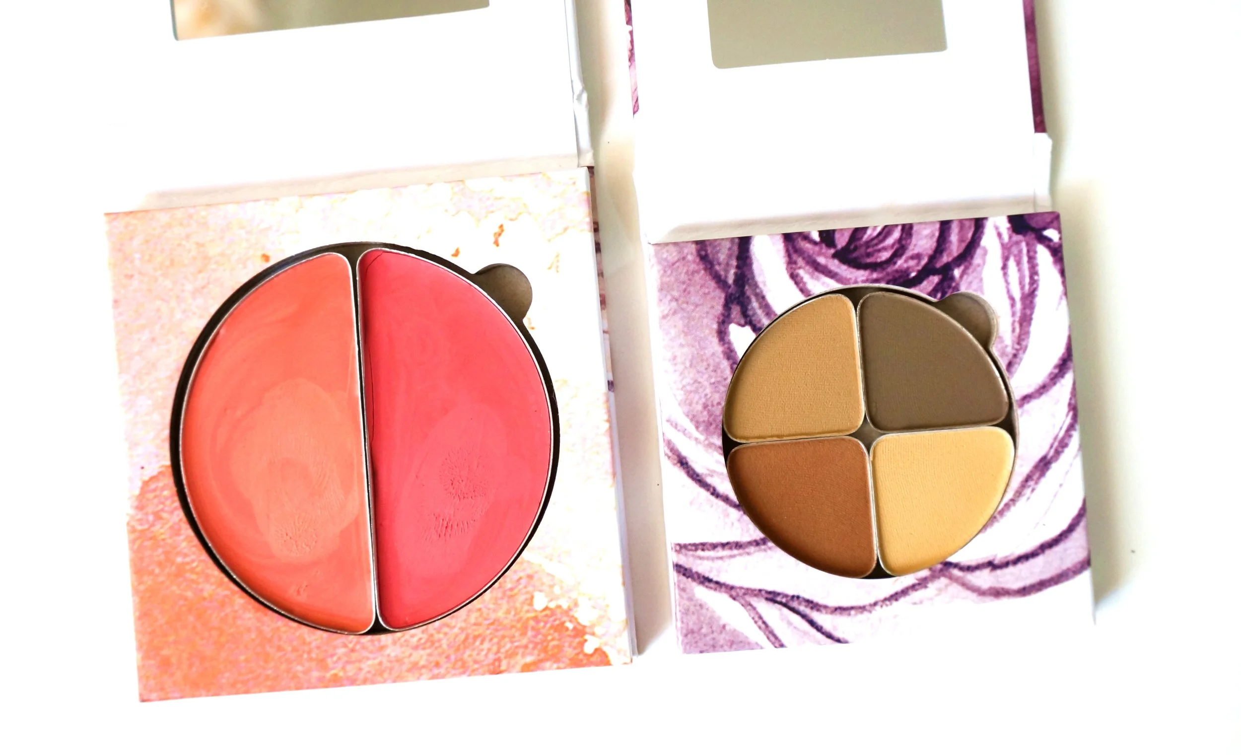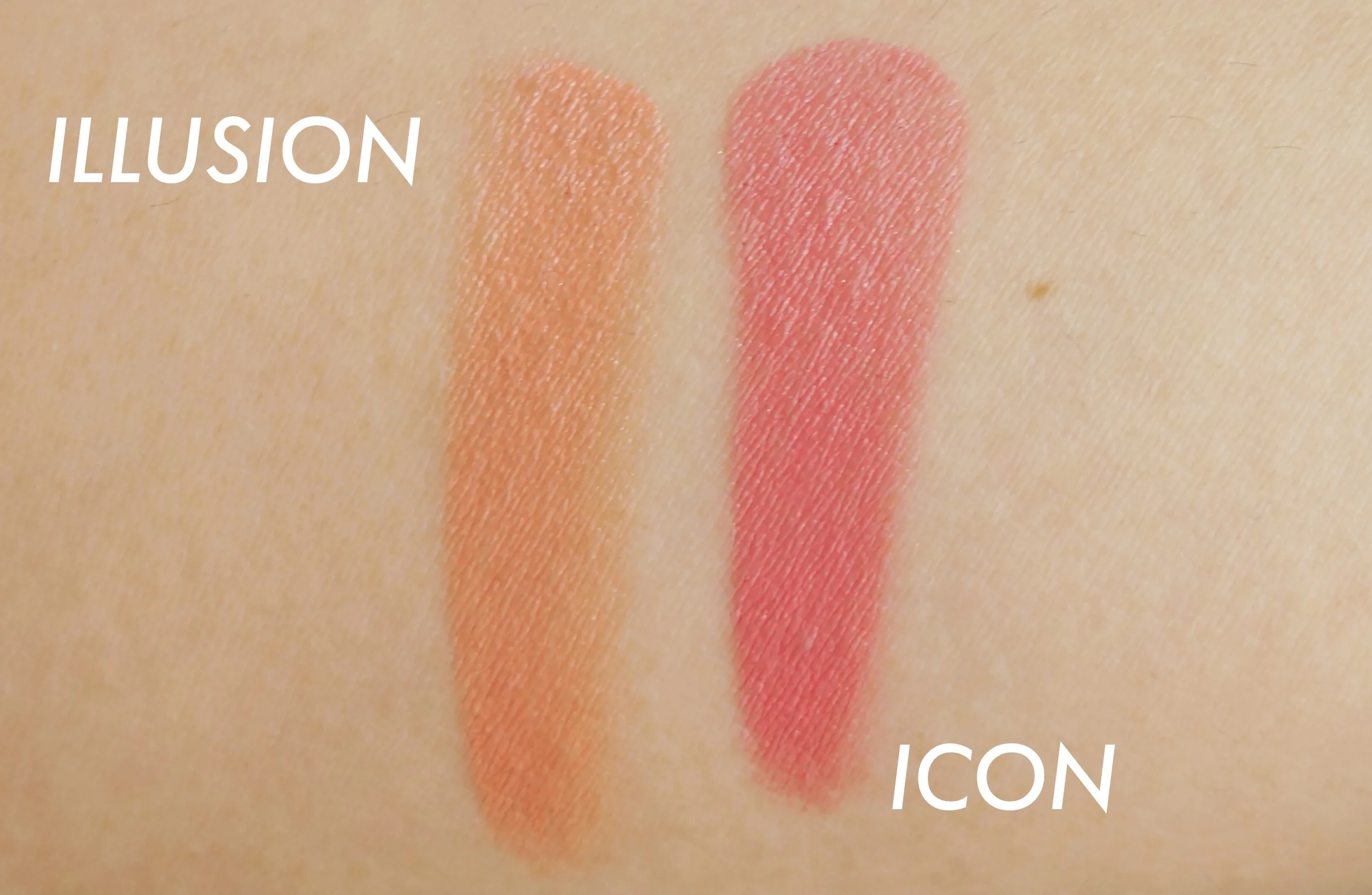 Illusion is a pretty, nudey peach while Icon is a bright, almost coral pink. You can apply them with your fingers or with a synthetic buffing brush.