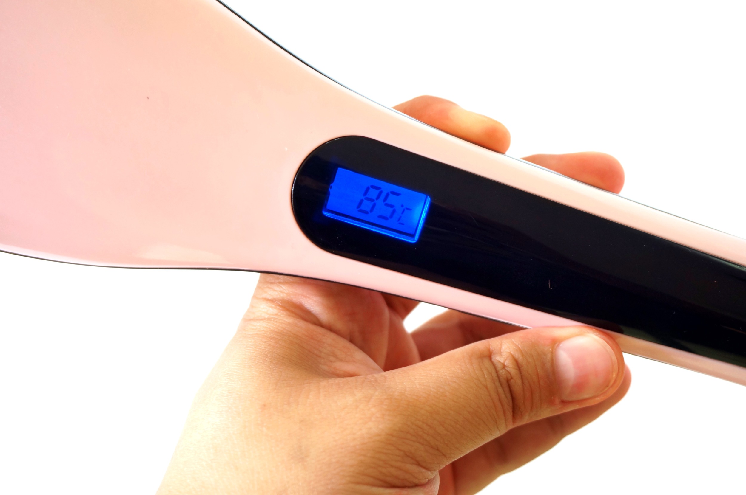 To turn it on, plug the cord in an outlet and press the power button located on the side of the brush for a few seconds. Then, adjust the temperature with the + and - buttons in the same row. You can view the temperature on the LCD screen in the back of the brush.
