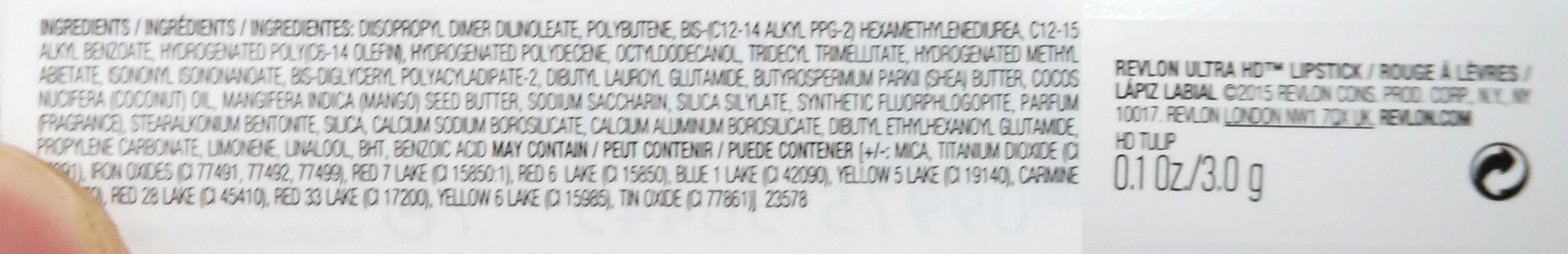 The Revlon Ultra HD Lipstick has a satin finish that makes lips look smoother and fuller. It doesn't have wax but it has oils and butters - these moisturize and smoothen lips while ensuring that the product glides on easily. It has a thin, lightweight texture that wraps lips in a glove-like embrace.