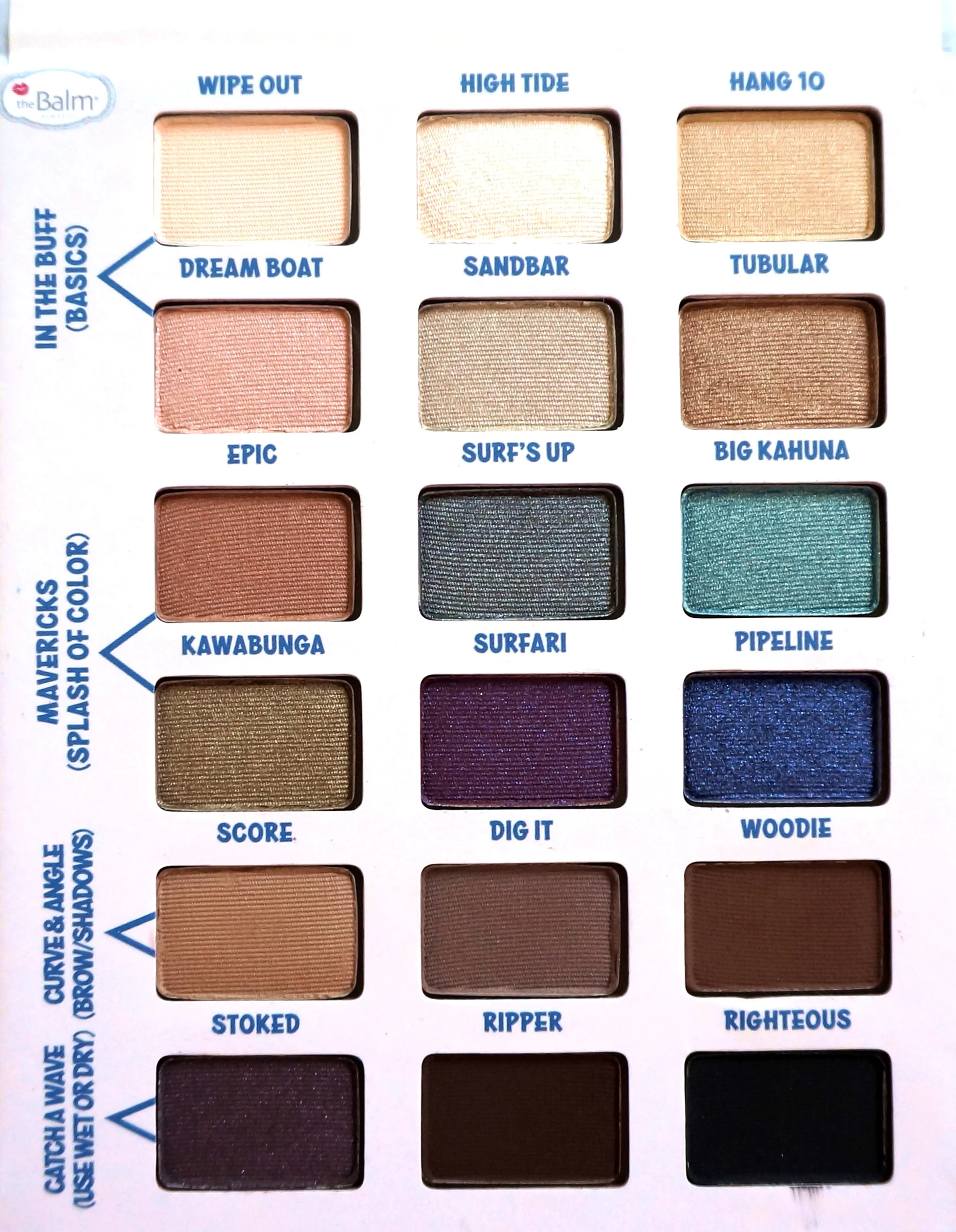 Wipe Out is a matte white for highlighting brows. High Tide is a white with shimmer flecks. So 80s imho. Hang 10 is a sandy shimmer color, perfect as a lid wash. Dreamboat is a pastel pink which I find too cool for my skin tone. Sandbar is a dove grey that flashes pink shimmer (also too cool), and Tubular is a light bronze. Is it obvious that these colors aren't exciting me?