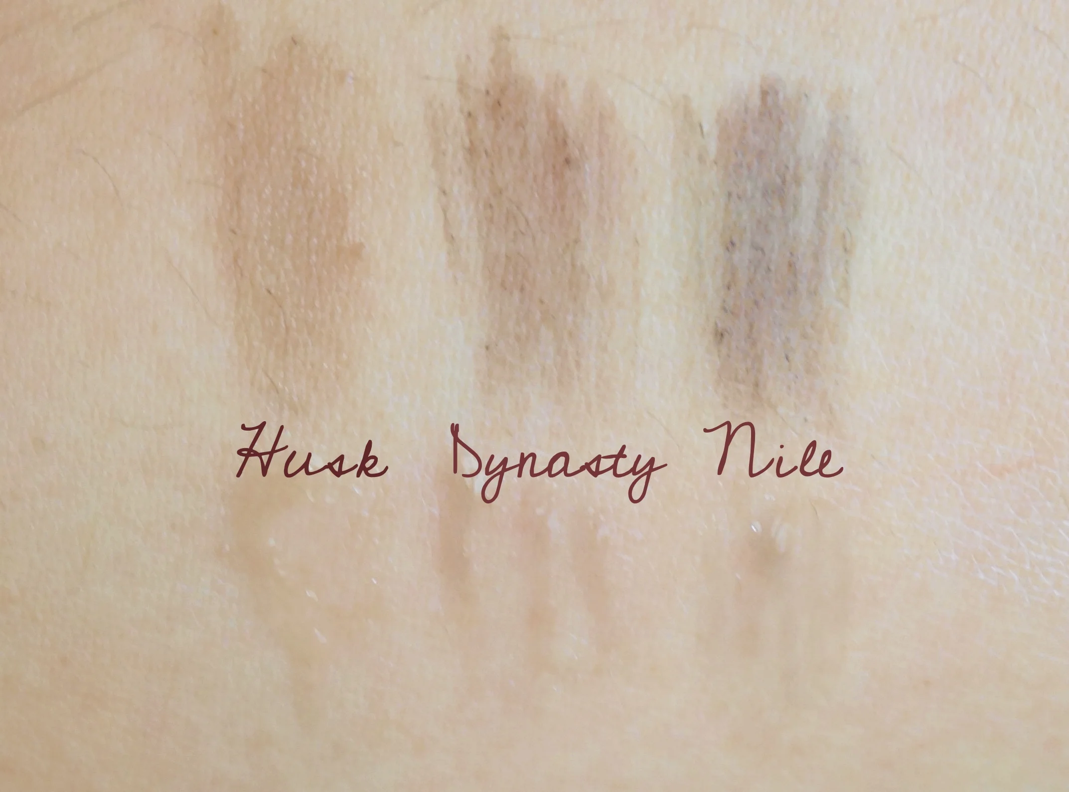 Above are swatches of the three shades, plus the barely tinted mascara. Husk is a light ashy blonde, perf for natural-looking brows, while Dynasty is browner, warmer. Nile is an ashy charcoal which I find too dark for my hair color. I recommend Husk if you have light dyed hair and Dynasty if you're a typical warm Filipina brunette.