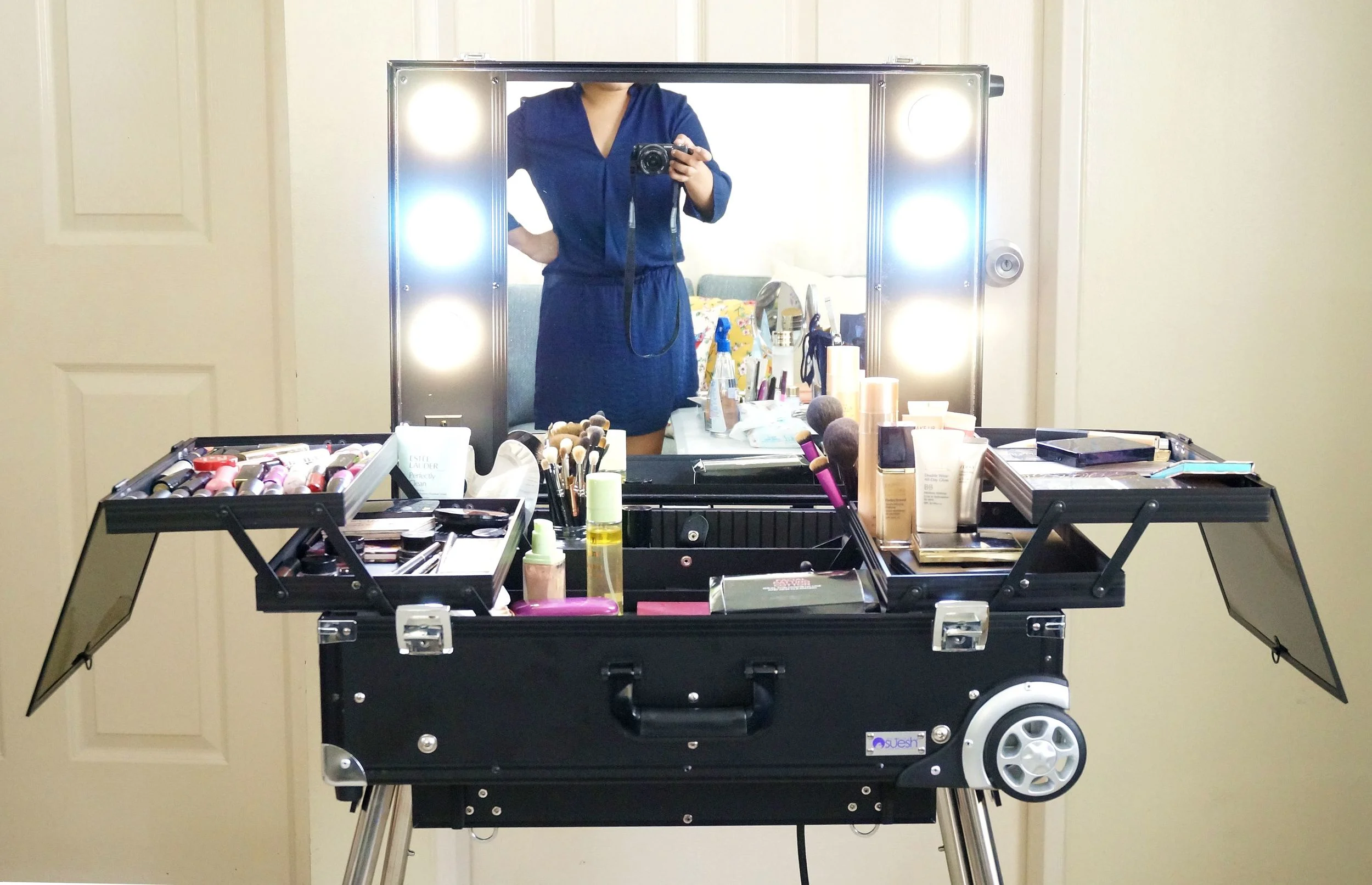Practically speaking, I use this professional-worthy train case for storing the products I demonstrate in my workshops. It also gives me great lighting for taking FOTDs and styled product shots for my blog. Should I need to do a demo outside of my home, I've got a mobile storage and display in a box that folds up and turns into a luggage I can pull on wheels.