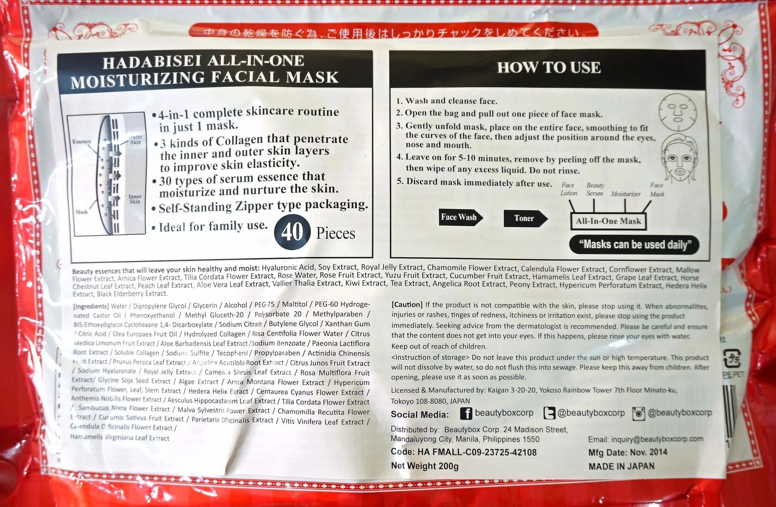 Today I'd like to talk about the Kracie Hadabisei All in One Mask (P795 for 40 sheets, available in Beauty Bar). This is different from all the other masks I've tried because it's actually meant to be used everyday. Yes, everyday, not twice or thrice a week like a normal mask. It can even be used twice a day! This is designed in lieu of skincare rather than an additional step. Ah, the Japanese. What will we ever do without 'em.
