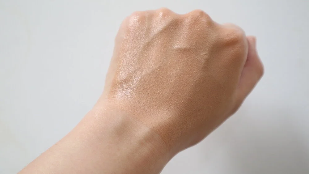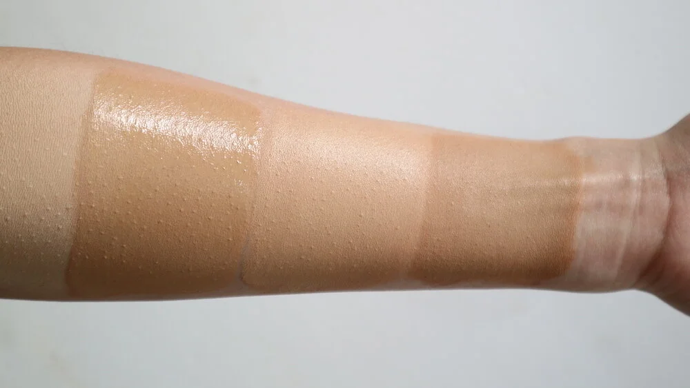To test this theory, I applied the FSG on the entire length of my inner arm. I swatched several types of bases over it: a powder foundation (Ellana Minerals Loose Mineral Foundation), a silicone-based liquid foundation (Make Up For Ever Ultra HD Liquid Foundation), and an oil-based cream-stick foundation (Make Up For Ever Ultra HD Stick Foundation), and a wax-based solid foundation (RCMA Foundation). While waiting for the foundations to set, I spotted a water-based foundation (Make Up For Ever Water Blend) and did an additional test on the back of my hand.
