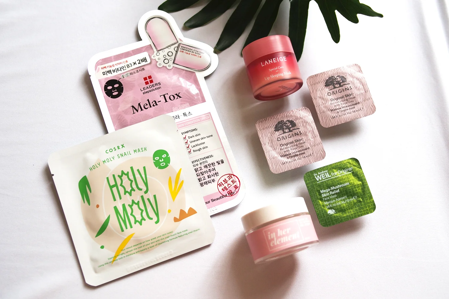 Leaders Stepsolution Mela-Tox (P178), CosRx Holy Moly Snail Mask (P135), Laneige Lip Sleeping Mask (P950), Origins Original Skin Retexturizing Mask with Rose Clay (P1,500 for the full size), Origins Mega Mushroom Skin Relief Face Mask (P3,200 for the full size), In Her Element Glow Job 5% Glycolic Gel Cream (P775)