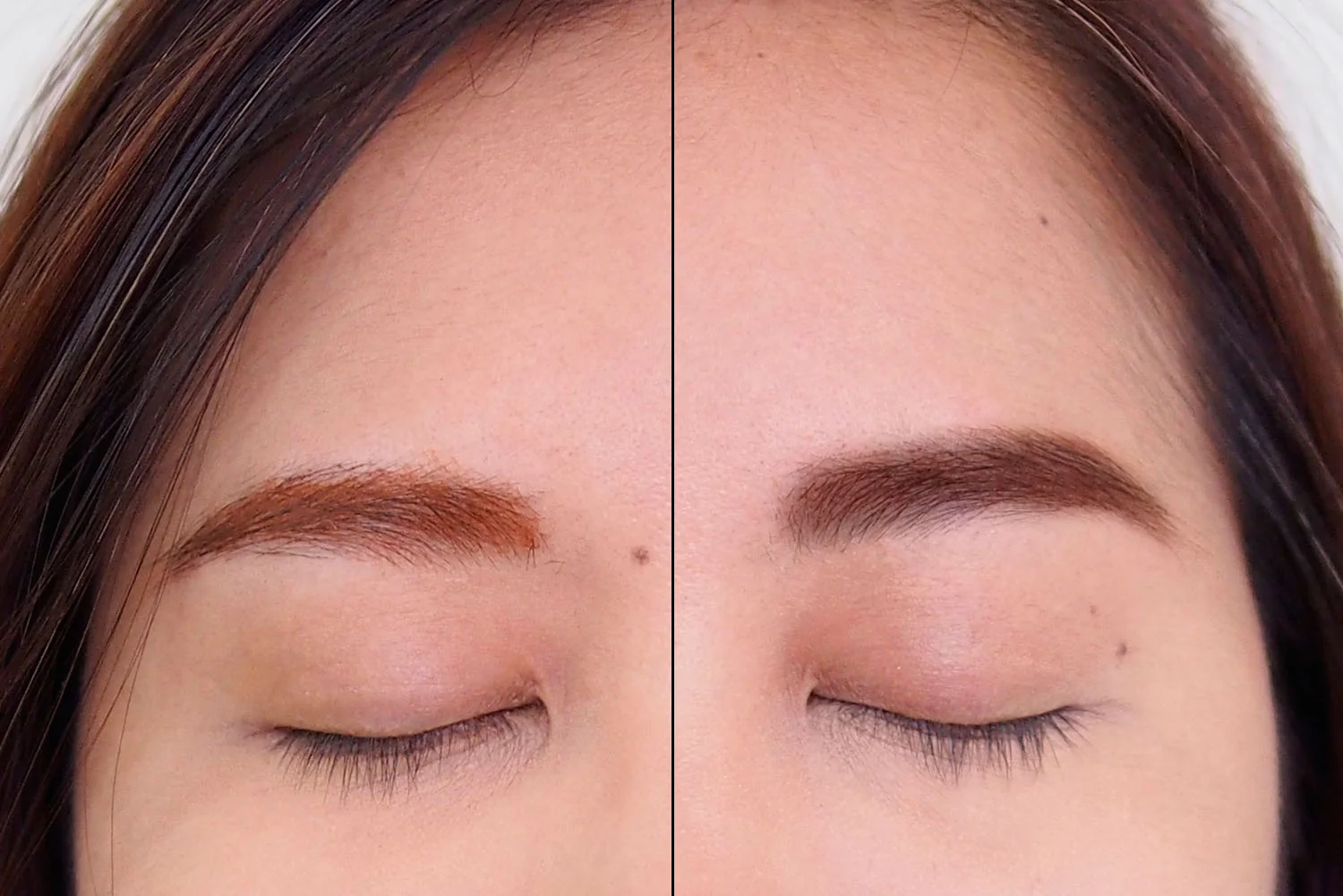 Left: Orange-tinged brow mascara, Right: Reddish brown brow mascara