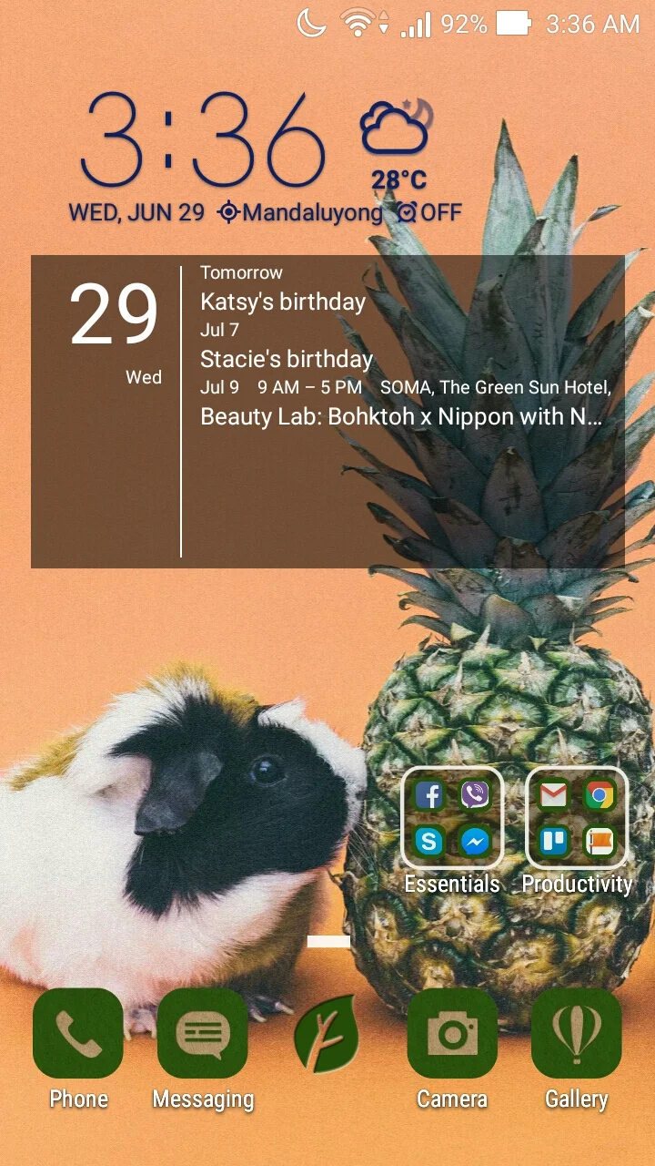 CUSTOMIZED HOME SCREEN. I'm currently using the Earth Day icon pack (free from Zen UI) and this cute photo I found in their extensive Wallpaper collection. Clock and weather widget comes with the phone while the calendar is by Simple Calendar.
