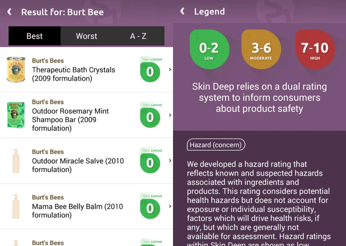 Although they are similar in many ways, Think Dirty is a bit better than Skin Deep. Think Dirty explains the use of the chemicals rated as hazardous and why you should avoid them. Think Dirty also offers alternatives to a scanned product that rated high in toxicity.