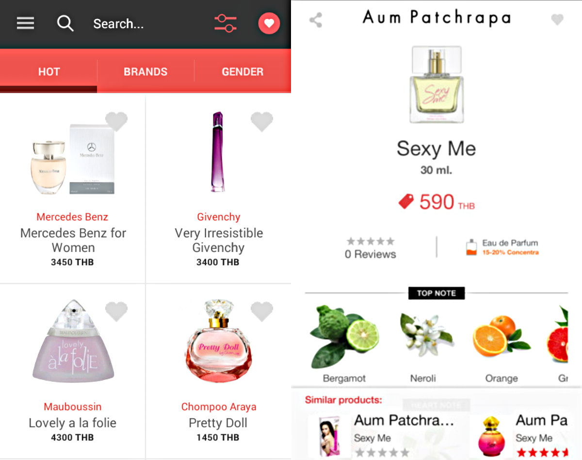 You can search for a perfume by gender, brand, concentration, and notes. You can also search for a specific perfume. Once you select a perfume, the app will show you its concentration, what its top notes are, and what products are similar to it.