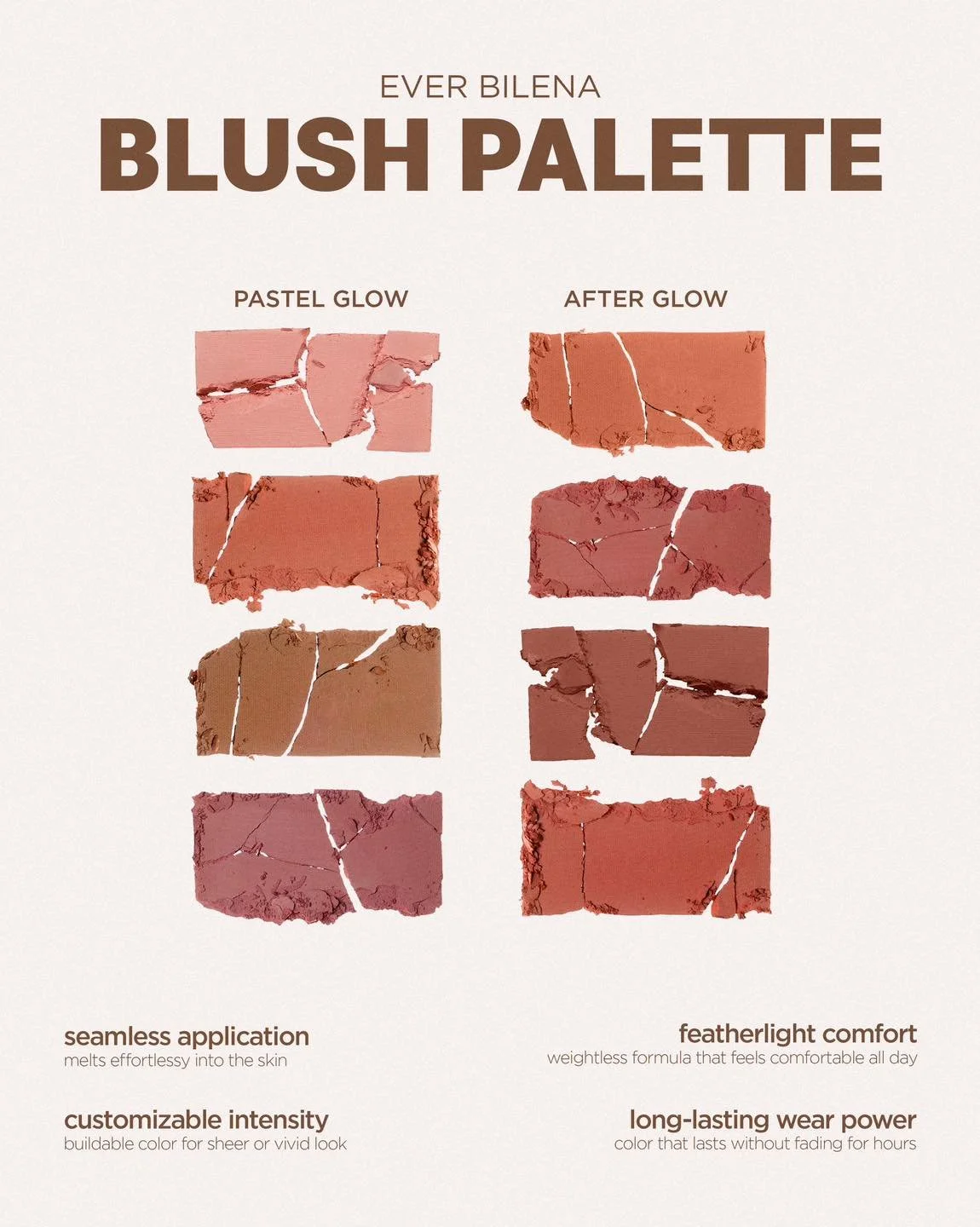 The Ever Bilena Blush Palette is a curated set of four (4) matte blushes in one convenient pact. Infused with Vitamin E, these are designed to add buildable sheer to vivid color that lasts. These come in two color sets: Pastel Glow and After Glow.