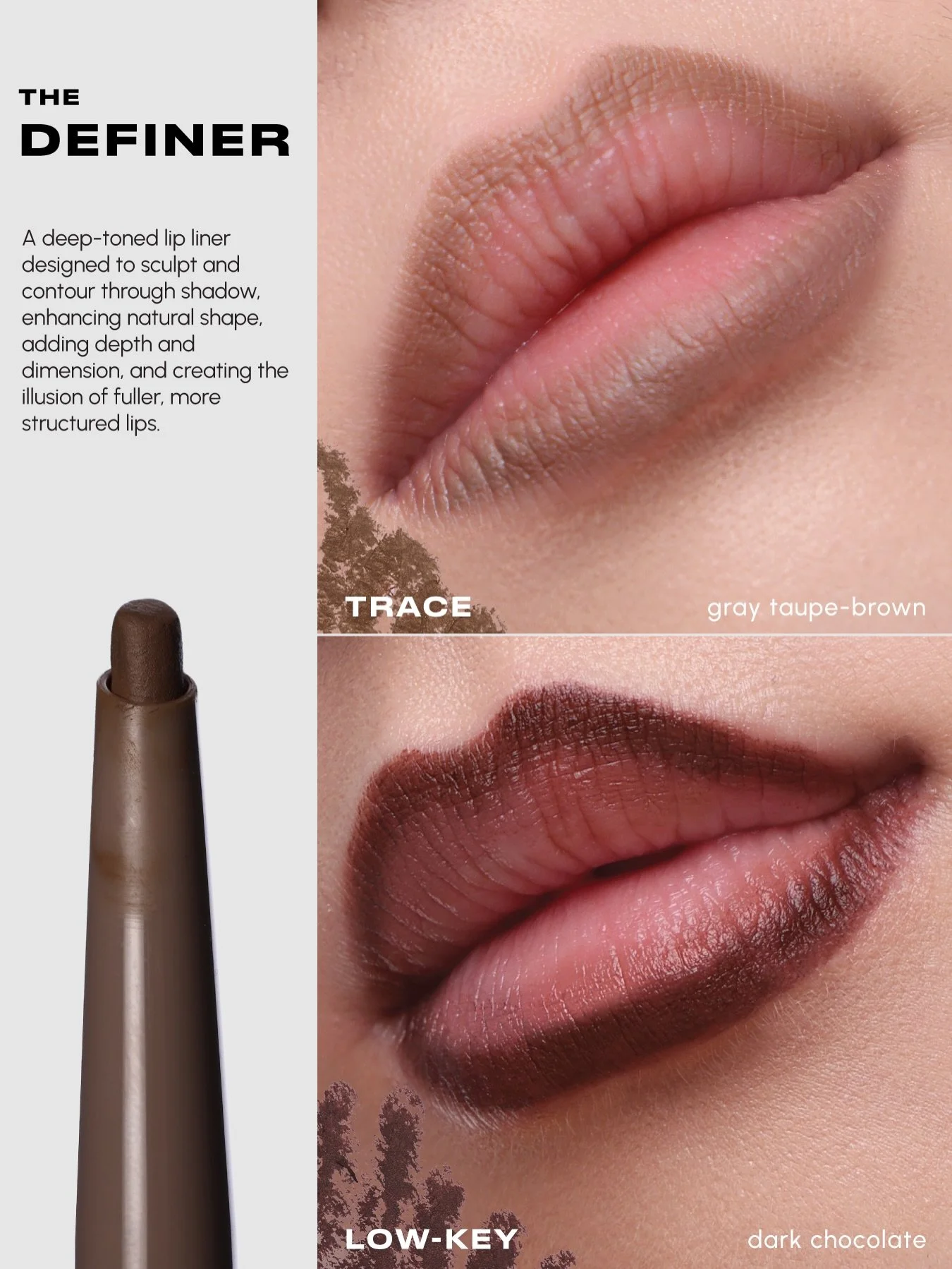 Up next, we have the Definer: a deep-toned shade you can use to create shadow and sculpt a fuller look! There are two (2) shades available: Trace (gray taupe-brown) and Low-key (dark chocolate). Tip: choose a shade darker than your natural lips! I can totally see this pairing well with a good lip gloss for the ultimate 90’s model cool girl look.