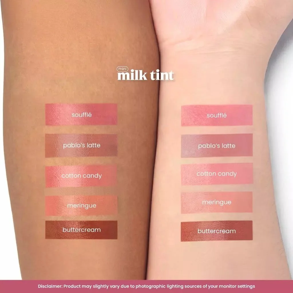 A total of five (5) Milk Tint shades were released as Minis: Soufflé (medium warm bright pink), Pablo’s Latte (medium neutral pink), Cotton Candy (light neutral muted pink), Meringue (light neutral nude peach), and Buttercream (medium warm rose).