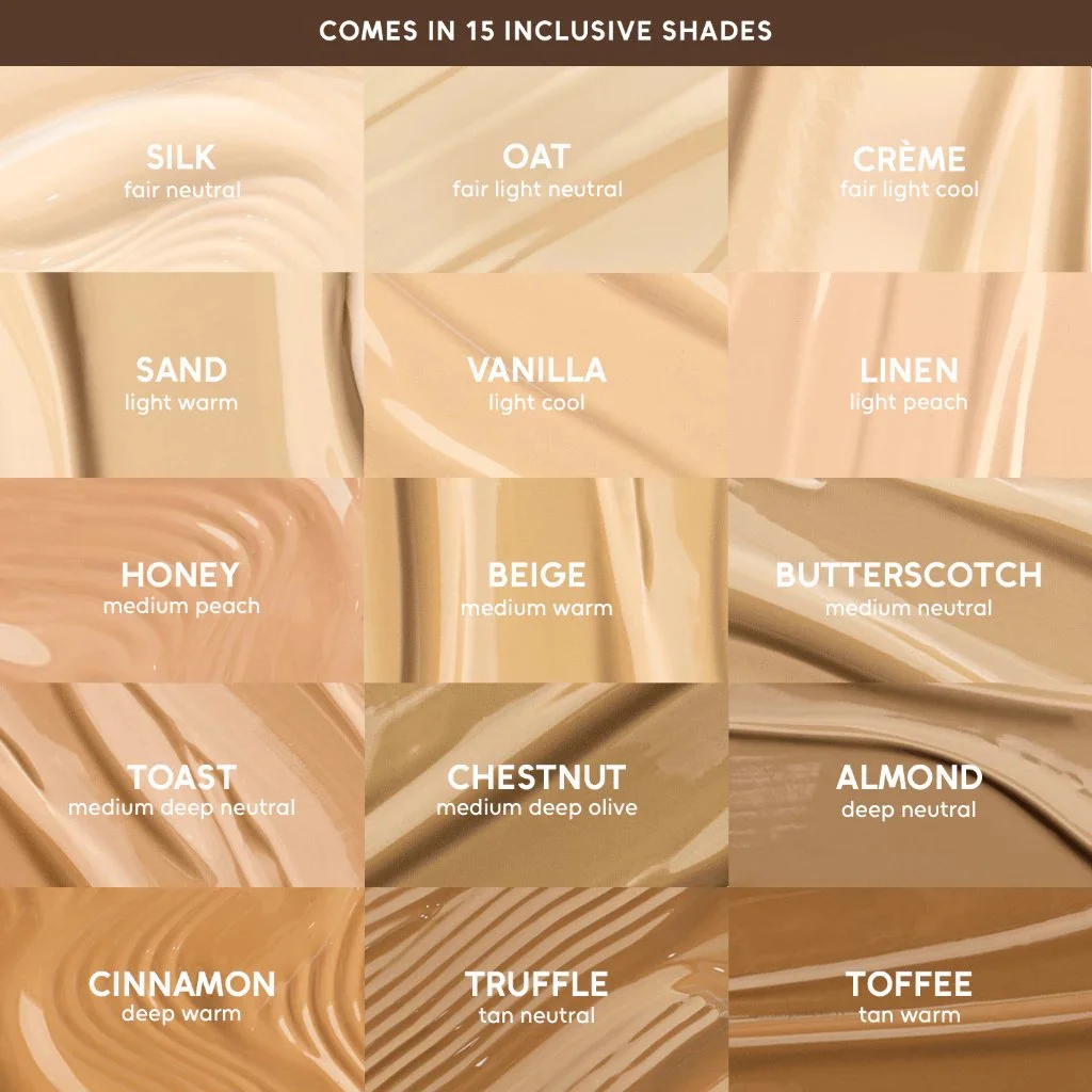 It definitely looks like the brand made an effort to be more inclusive with the shade range with this foundation. There are 15 shades to accommodate a range of skin tones and undertones: Silk (fair neutral), Oat (fair light neutral), Creme (fair light cool), Sand (light warm), Vanilla (light cool), Linen (light peach), Honey (medium peach), Beige (medium warm), Butterscotch (medium neutral), Toast (medium deep neutral), Chestnut (medium deep olive), Almond (deep neutral), Cinnamon (deep warm), Truffle (tan neutral), and Toffee (tan warm).