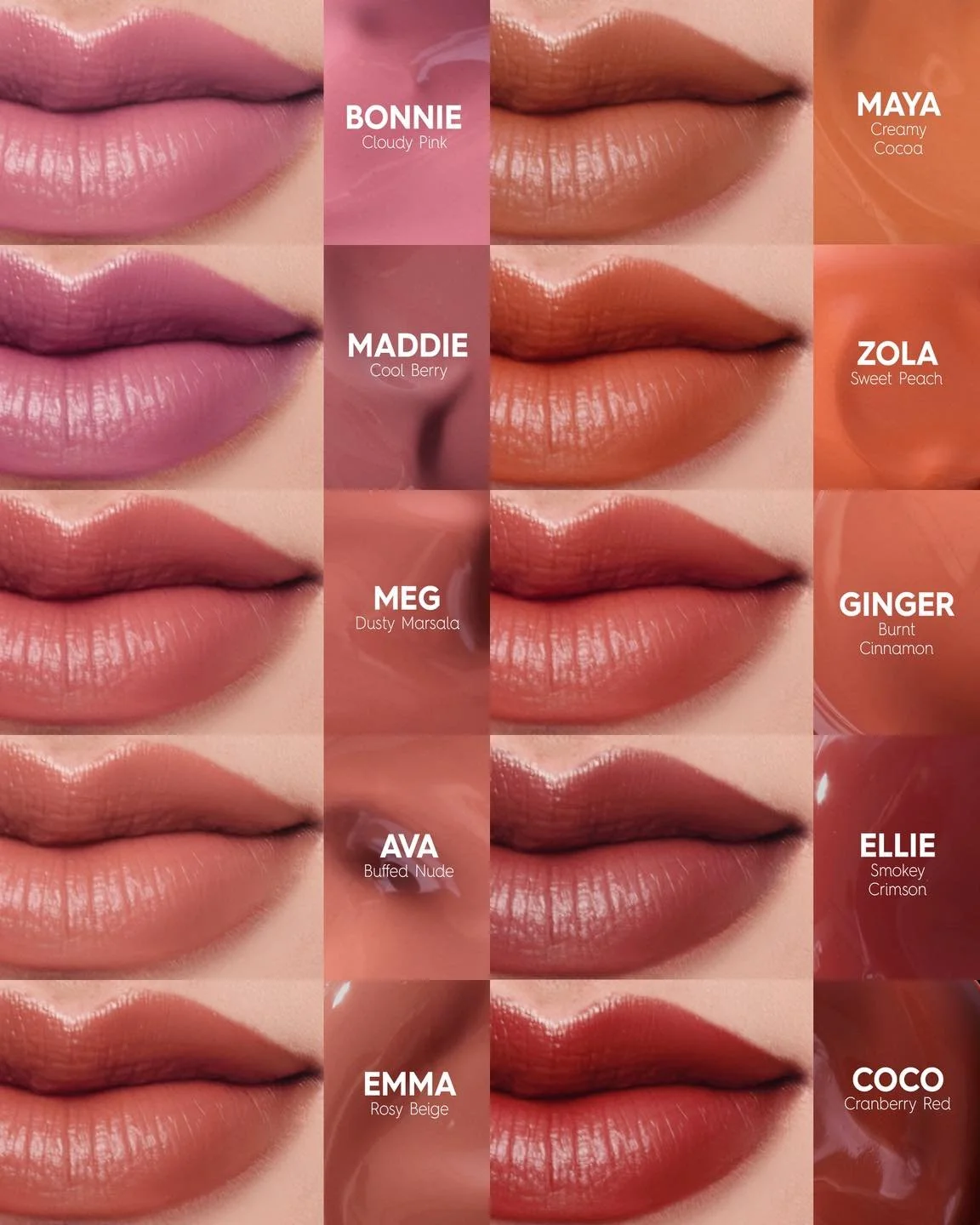 It comes in ten (10) of the brand’s best-selling shades: Coco (cranberry red), Ellie (smokey crimson), Maddie (cool berry), Zola (sweet peach), Ginger (burnt cinnamon), Maya (creamy cocoa), Meg (dusty marsala), Emma (rosy beige), Ava (buffed nude), and Bonnie (cloud pink).