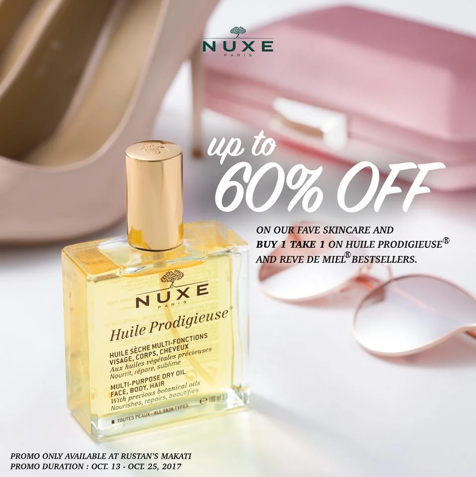 Craving for some luxurious French skin care products? How about if we told you that you could snag some iconic products at a fraction of the cost? Head on over to the NUXE Animation at Rustan’s Makati until October 25 for some awesome deals! Select NUXE skincare products will be discounted for up to 60% off, and they even have an amazing Buy One, Get One deal for their iconic Huile Prodigieuse dry oil and Reve de Miel. Let’s get shopping!