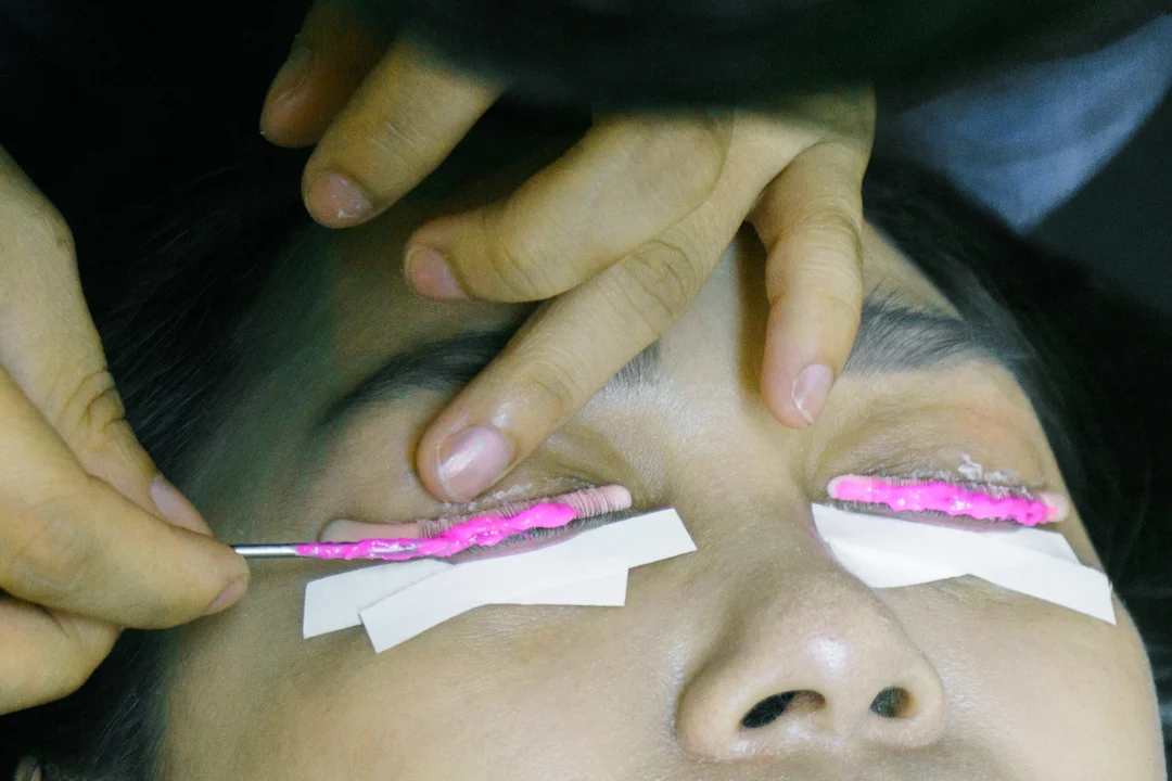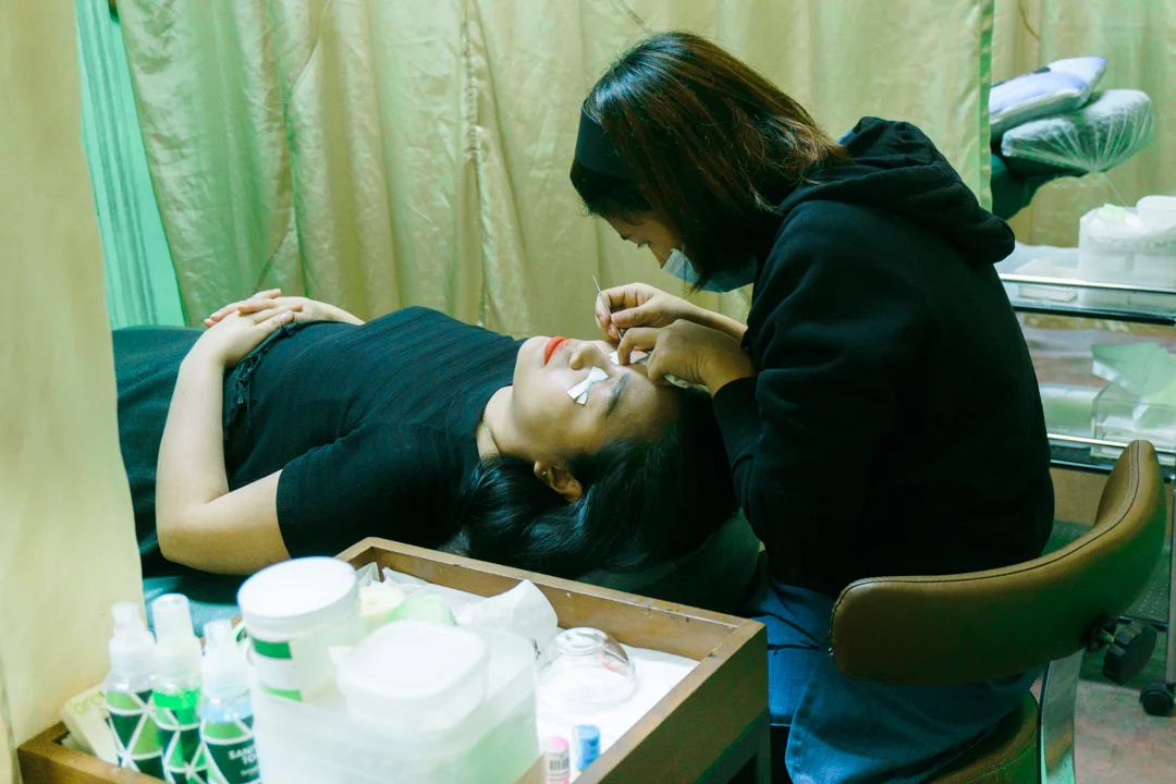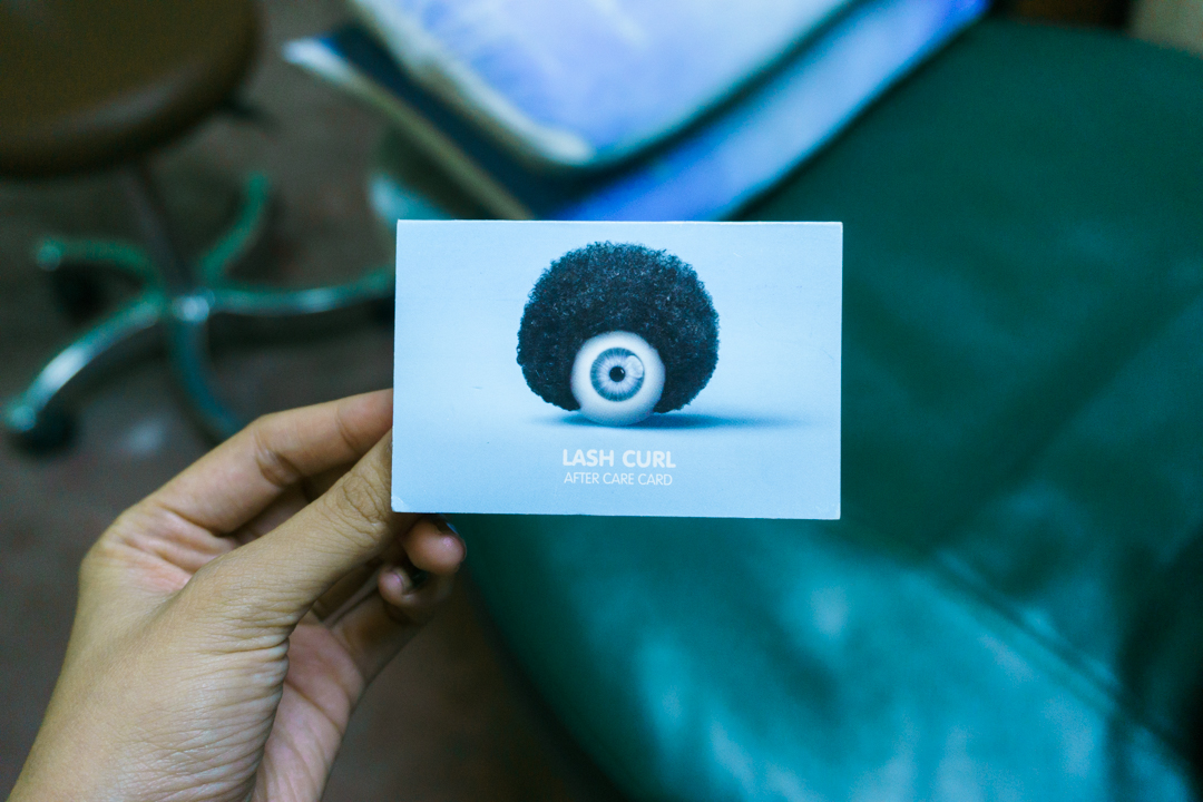 The pink hard plastic strips are called plalots, and used as a guide and base for the lashes be adhered to. Each single hair strand is carefully arranged and attached here with a special lash glue, so that resulting curl is carefully controlled. The therapist gave me the option between a natural-looking curl or a Barbie Doll-type of curl, which is more dramatic and gives a wide-eyed effect. Nine chose the latter one since we were both curious about how that would look like. My eye area was cleaned, and my lower lashes were taped down and covered so that they wouldn’t curl up as well. From then on, I had to keep my eyes shut for about an hour and a half so make sure to visit the restroom beforehand and bring your own headphones so can listen to the Project Vanity Podcast while getting your treatment!