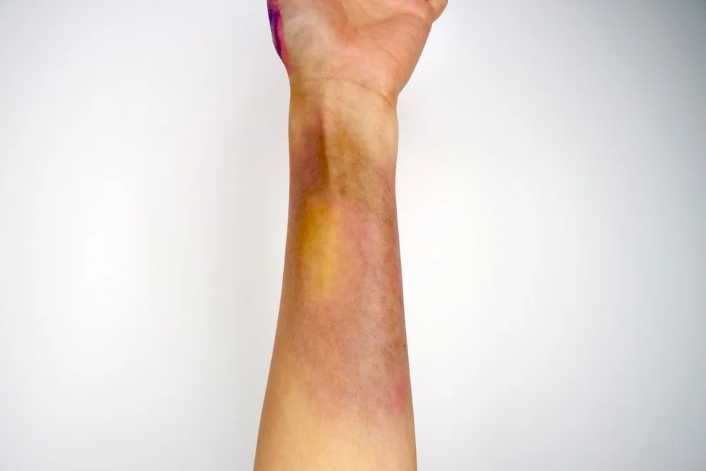 The colors are truly what I’d pick up for bruise effects, though I would have preferred a red and black shade as well to help add dimension and drama to the bruising. The yellow is pretty spot on for peripheries and healing bruises, while I mostly mixed the remaining three colors to make them look realistic. The purple spreads pinkish/fuschia on the skin and was not something I could layer by itself, but overall the wheel is still great value for money!