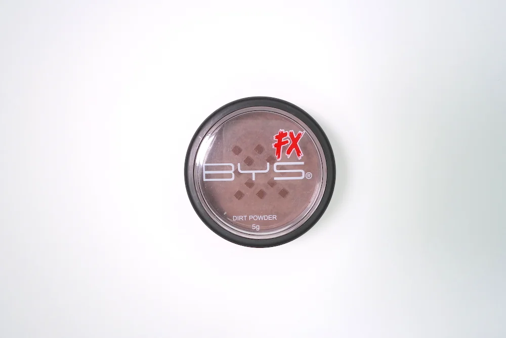 The BYS Special FX Dirt Powder in Brown (P549 for 5g) is a tub of loose brown dirt powder. It’s great to dump over clothes and rub everywhere on the skin and clothes for that action star effect. It rubs well onto skin and over fake blood. The pigment doesn’t bleed, as is the problem if you try to make do with old eyeshadow.