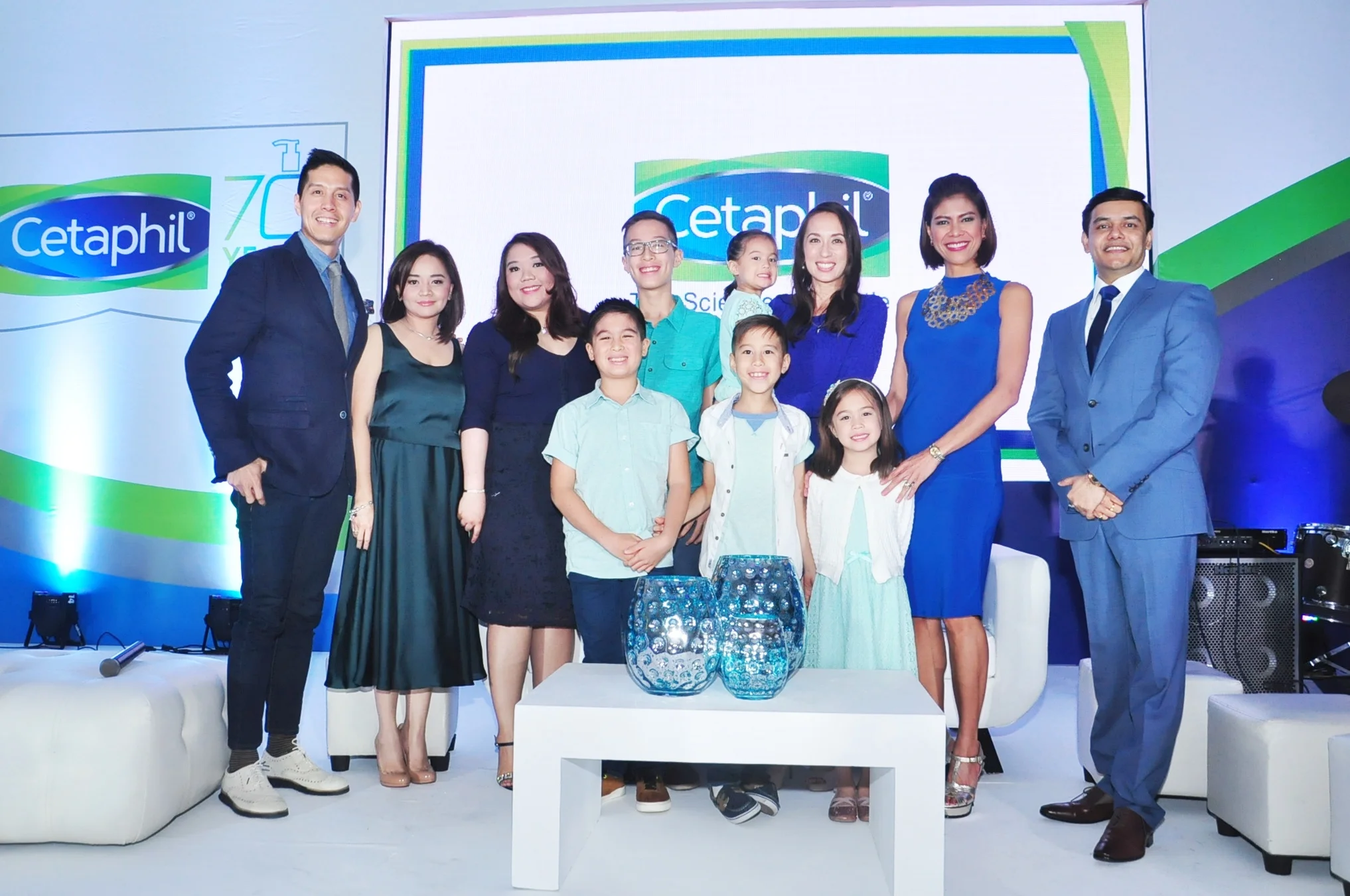 The Galderma team - Jade Silva Netto-Ponoc, Catherin Palma-Dilanco and Raghavendra Sadashiva with host Suzi Entrata and Cetaphil endorsers the Mendoza family, Edric, Joy, Elijah, Edan, Titus, Tiana and Catalina
