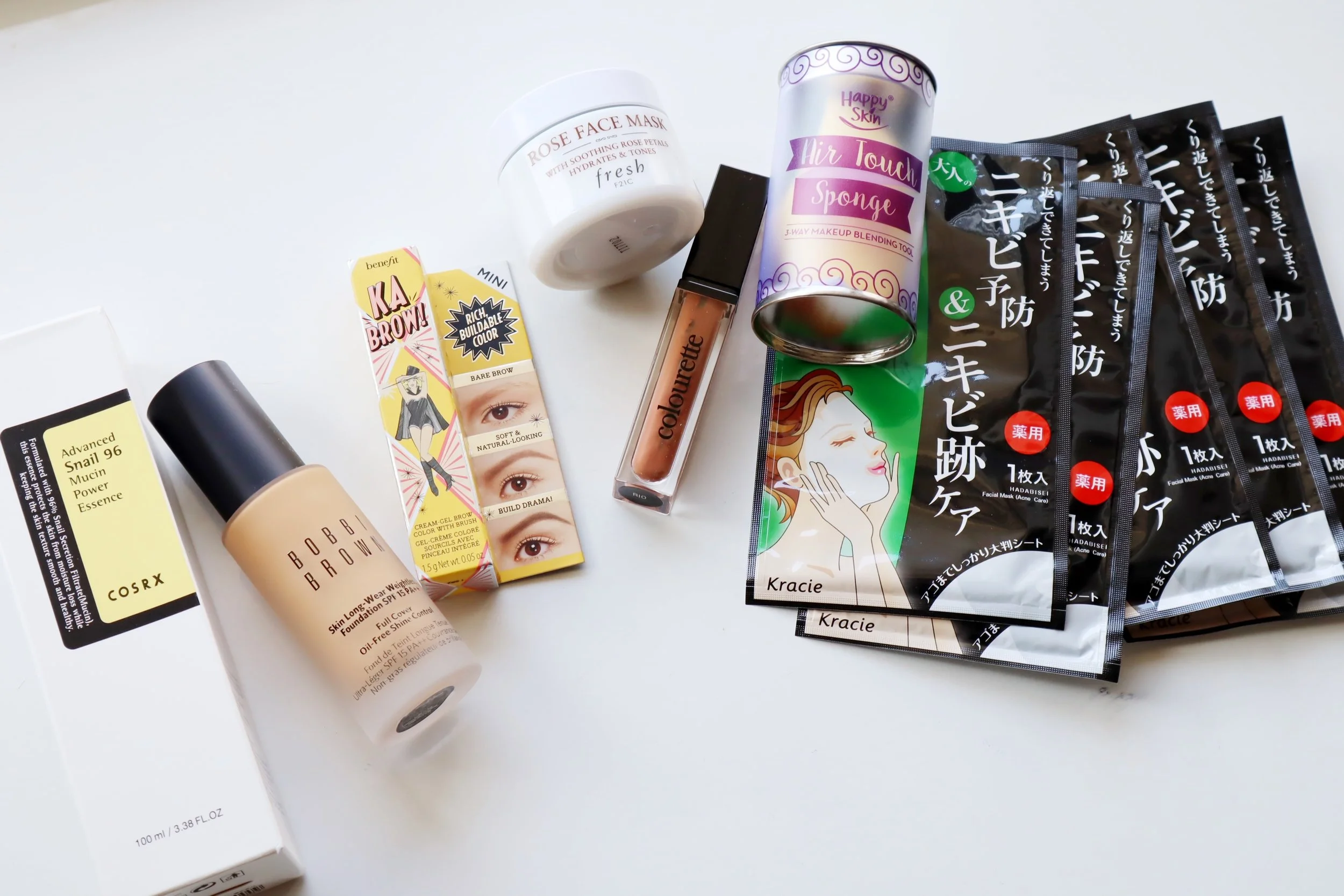 Bobbi Brown Skin Long-Wear Weightless Foundation SPF15 PA++ (in shade 4.75 Golden Natural), Fresh Rose Face Mask, Hadabisei Moisturizing Face Mask (Acne Care), CosRX Advanced Snail 96 Mucin Power Essence, Benefit Ka-Brow Cream-Gel Brow Color, Happy Skin Air Touch Sponge, Colourette Supramatte (in shade Rio)