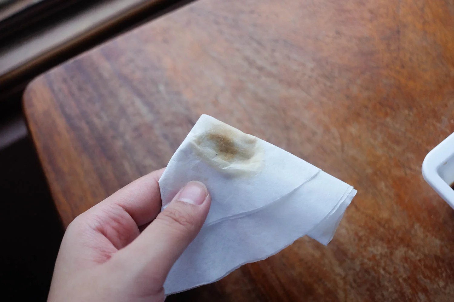 Step 3: Wrap a coffee cube in a a coffee filter (or thin cloth towel if you don't have one) and apply it directly on your eye bags. You can press it gently around each eye for five to ten minutes - something you could do while binging on Netflix. ;) The pressing motion will help drain the fluids under your eyes as well as distribute the coffee evenly .