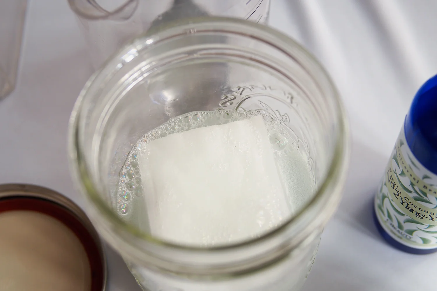 Step 2: Place a few cotton pads inside the airtight container and pour the mixture over it. Press down to help absorb the liquid. Add more pads and repeat the process until the container is full.