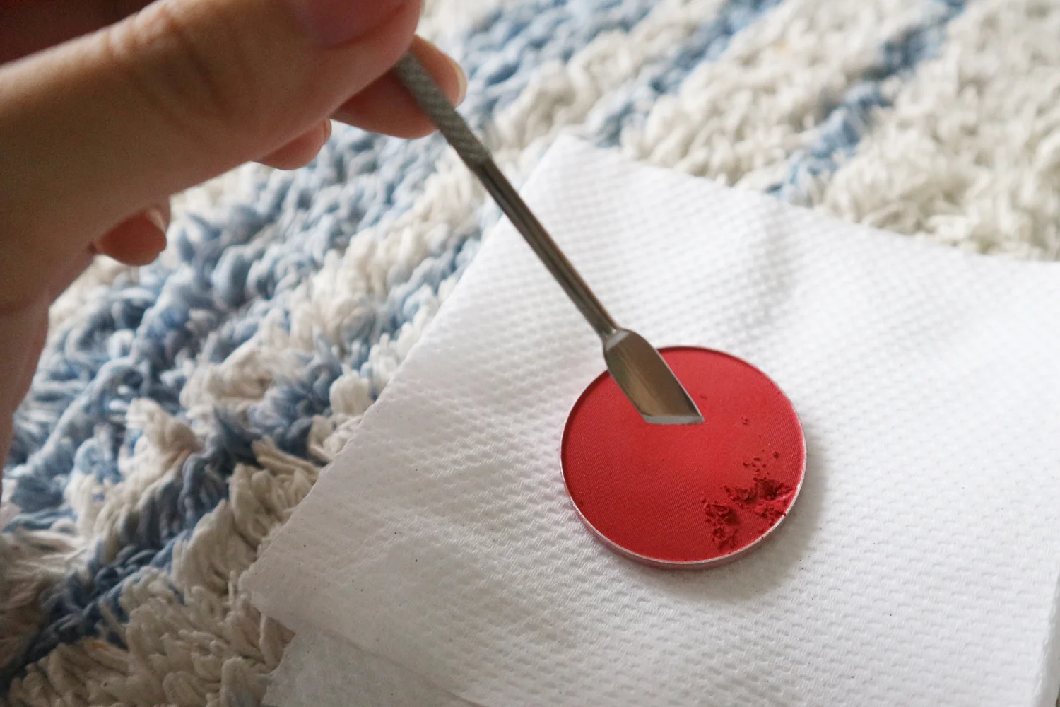 Step 1. Pop the shadows out of the palette and start crushing some of the pigment with the metal tool.