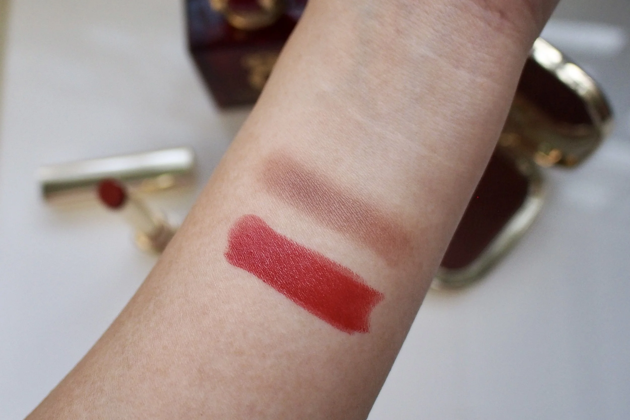 Swatches from T-B: Dolce & Gabbana Face & Eyes Match in 06, My Sculpt Satin Lip Stylo in MY 03.07