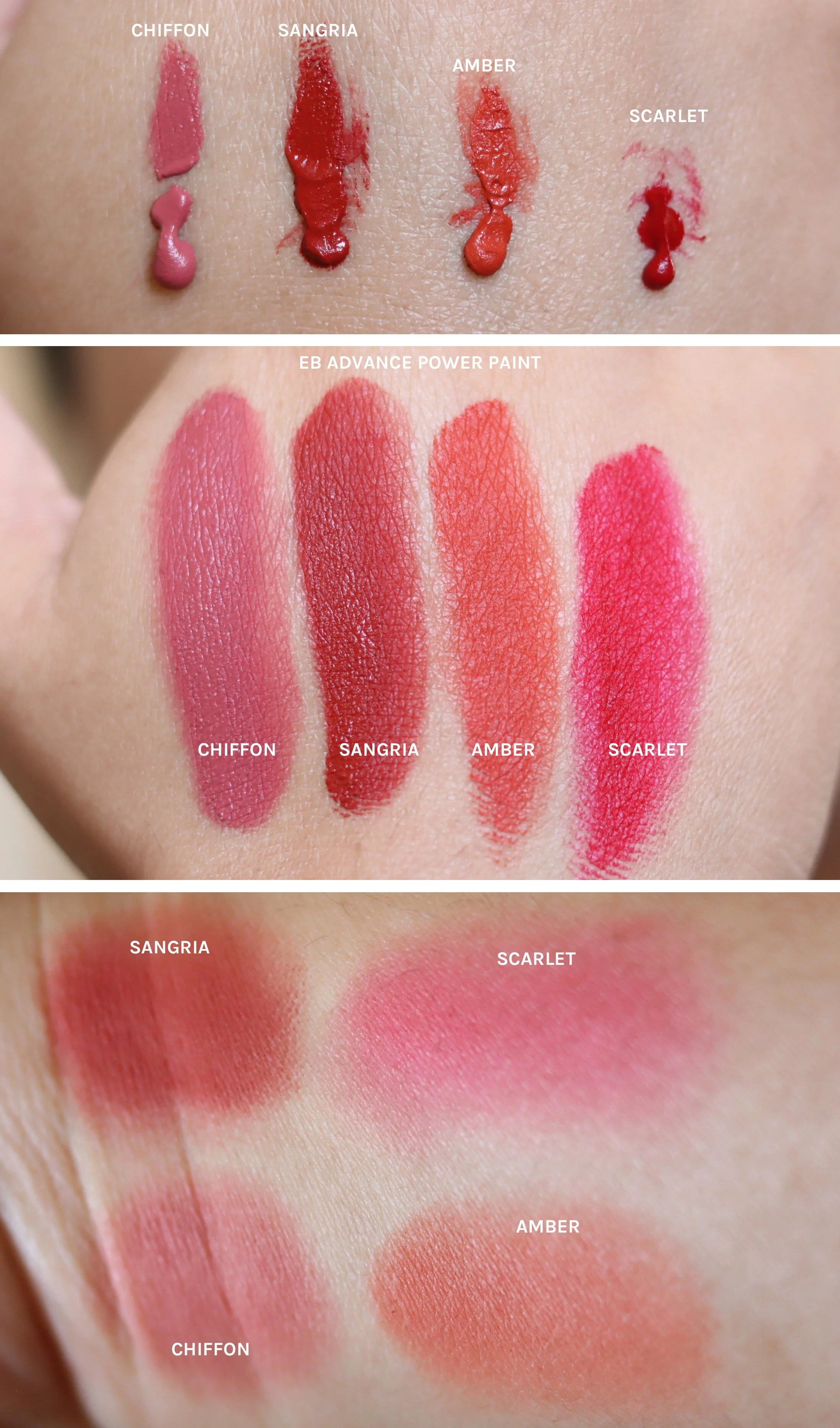 The EB Advance Power Paint is actually a dense, ultra pigmented mousse-y cream. Imagine a mousse-type liquid lipstick, that’s exactly how it feels. It’s designed to be A LOT easier to blend though; there’s plenty of give even with only a tiny dot of the product. You’ll be surprised how far it spreads around even with only a sheer layer! It’s also completely buildable. You can start with a soft hint of color, or immediately go all out with a full opaque layer in one layer. That’s what makes it so versatile.