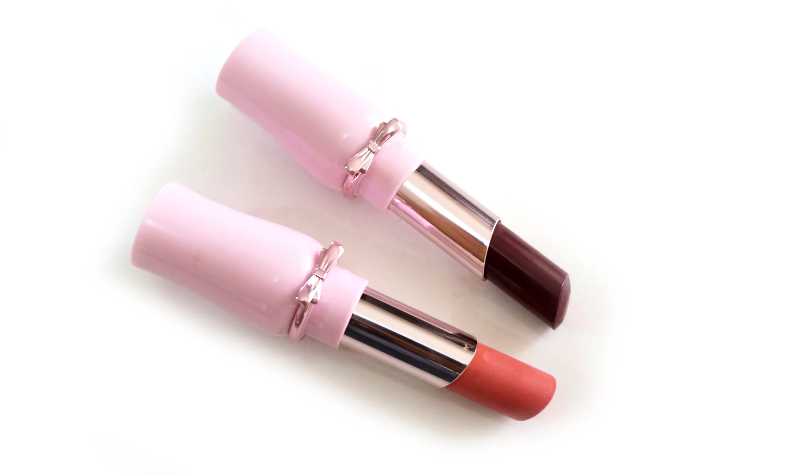 Dear My Wish is poor in terms of wear at only two to two and a half hours, but I do like that it's hydrating; it doesn't flake or pill on my lips, which makes retouching much easier. I have two of the ten colors available in this like: BE101, a cute peachy nude, and RD302, a daring plummy red.