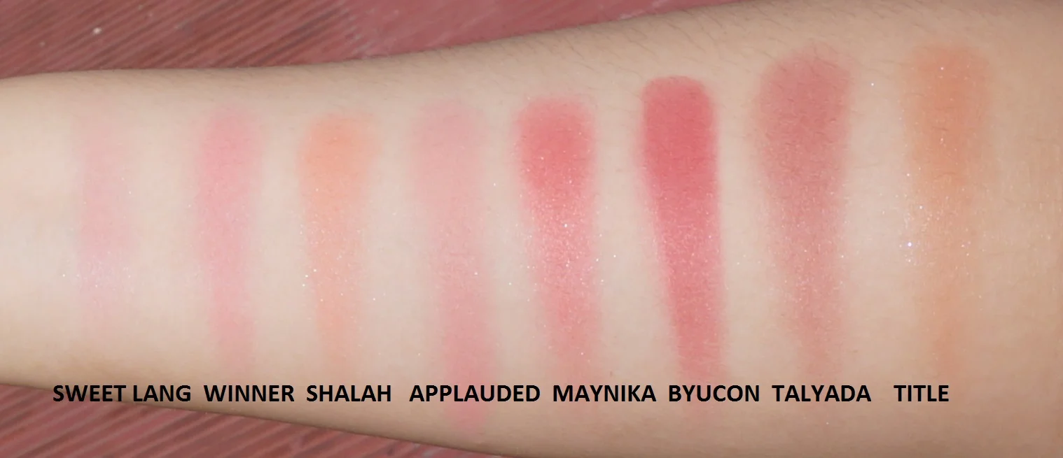 As for the two contour powders, I am thrilled about having matte contour powders that are suitable for light to deep skin tones! Porsyur is a milk chocolate that will work for light to medium skin tones while Confeeerm is a chocolate color that will complement medium to deep skin tones. The formula for these are better than the blushes - they are creamier and apply more smoothly. Confeeerm is especially quite pigmented so better to apply with a light hand. (In person, these contour powders are matte. The sun was shining very brightly the day I took swatch photos, and the oils on my arm may have been reflecting light).