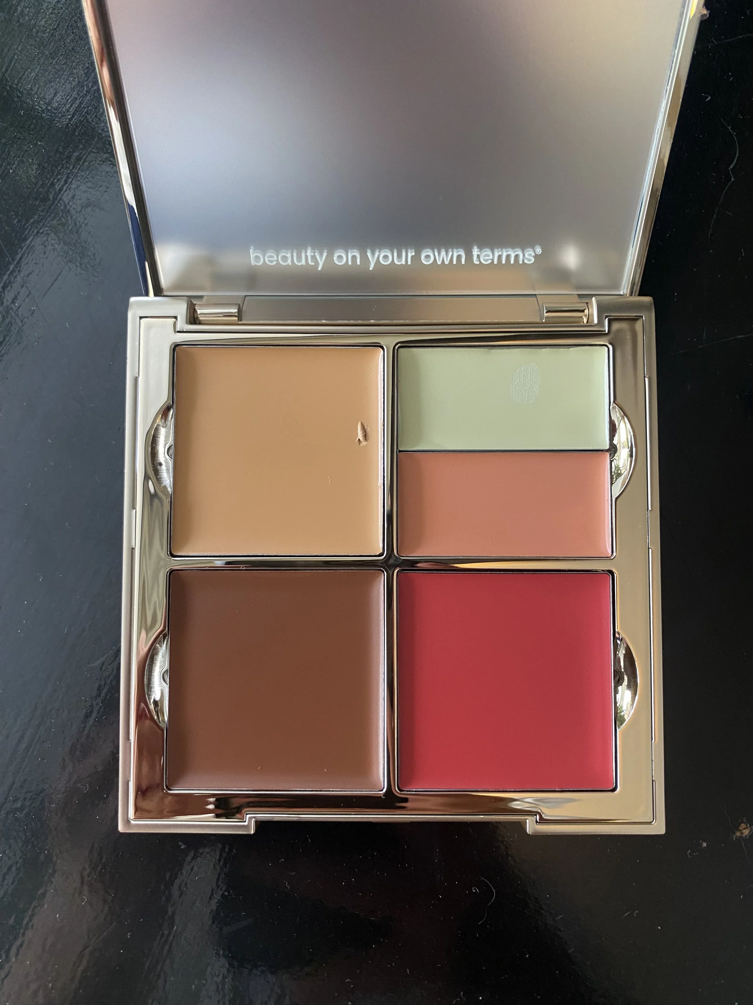 My cream palette has everything I need for my base: the Multiuse Complexion Cream in shade Camel (upper left), Cream Bronzer in shade Barcelona (bottom left), Satin Cream Blush in shade Poppy (bottom right), and two Color Correctors (upper right) in shades Kiwi (top) and Tangelo (bottom).
