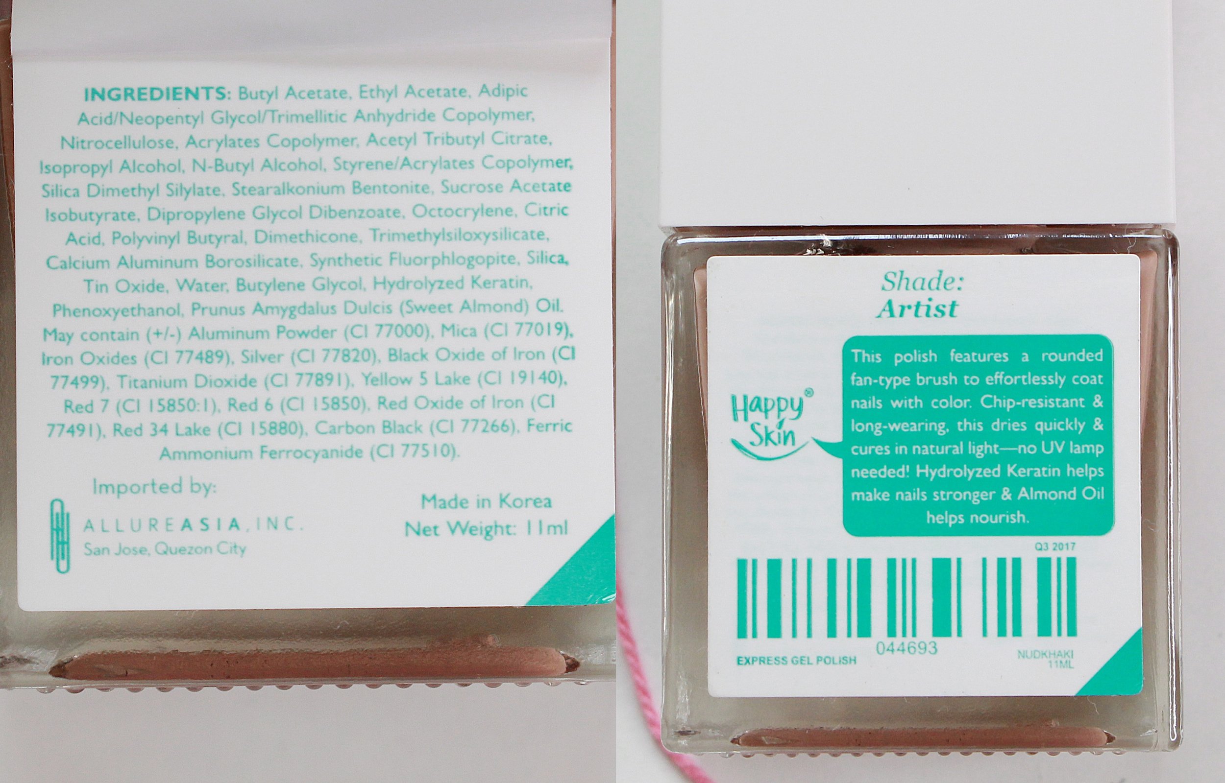 Nevertheless, I'm pretty happy with Happy Skin's first stab at nail polish. The price is right, the opacity and drying time are good, and the colors (mostly neutral and meant for versatility) are right on the money. I have a feeling I'll be wearing Artist often! Try the Express Gel Polish out if you like the shades.