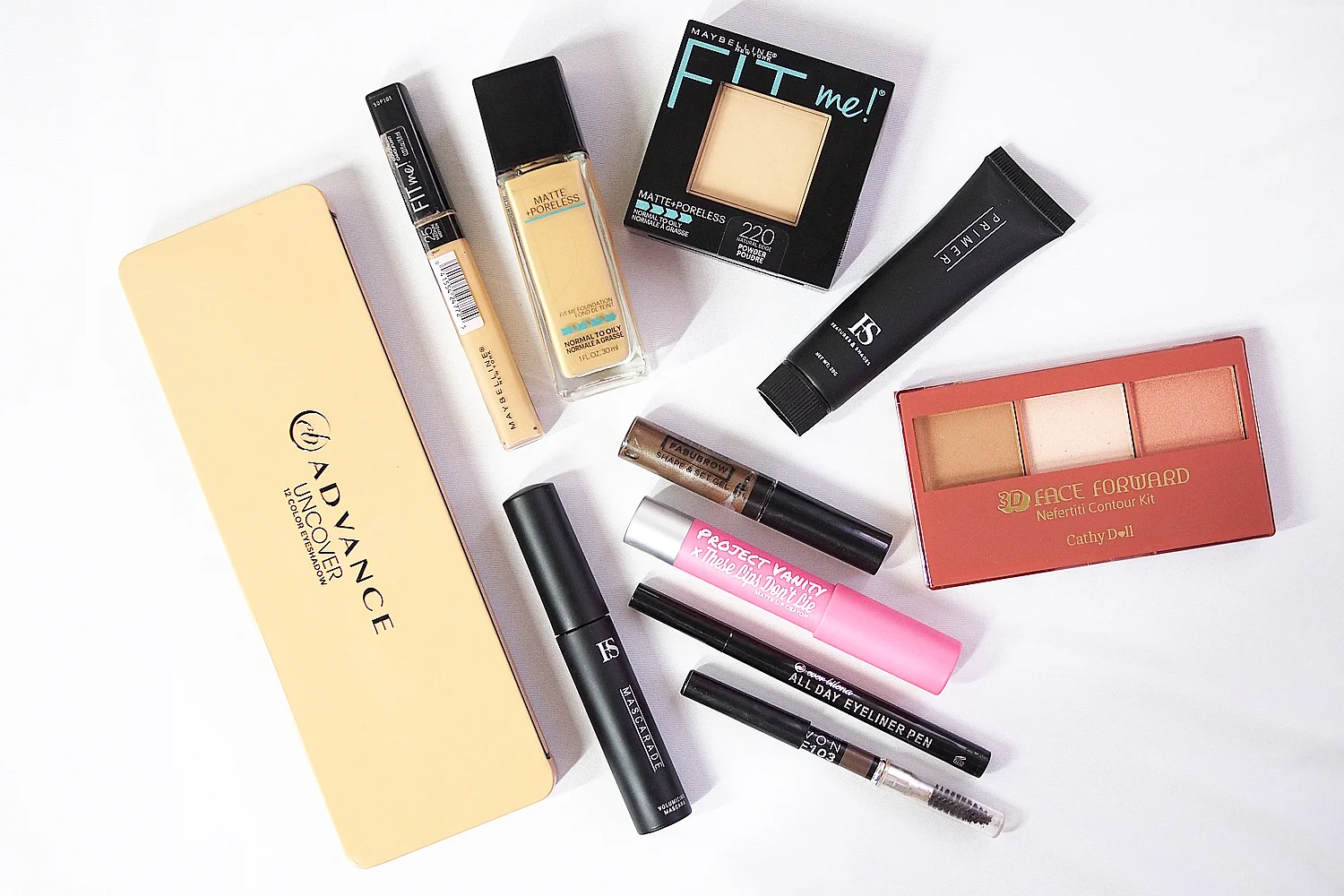 My below P500 FOTD: Maybelline Fit Me Matte + Poreless Liquid Foundation (P399), Maybelline Fit Me Concealer (P199), Maybelline Fit Me Pressed Powder (P399), EB Advance Uncover Palette (P375), Cathy Doll 3D Face Forward Nefertiti Contour Kit in Nefertiti Weapon (P299), Pink Sugar x Project Vanity These Lips Don’t Lie Matte Lip Crayon in Love at First Swipe (P399), Ever Bilena All Day Eyeliner Pen (P200), Jordana Fabubrow Shape & Set Gel (P399), Avon True Color Dual Ended Brow Pencil (P250), Features & Shades Primer (P299), Features & Shades Mascarade (~P500)