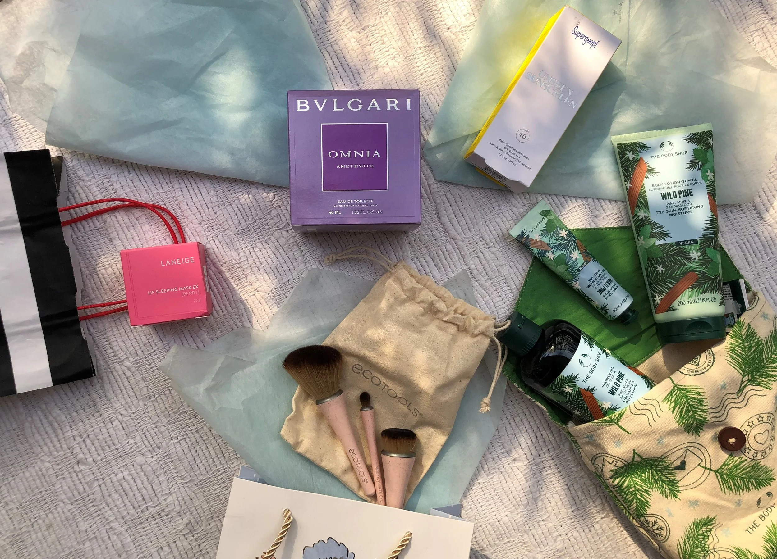 For our honeymoon I was gited the Supergoop Unseen Sunscreen for our beach trip and an Ecotools brush set perfect for my on the go makeup kit. They also gifted me a The Body Shop set in a relaxing scent as well as a Laneige lip mask for a perfectly moisturized lip. My mother gifted me the Bvlgari Omnia Amethyste Eau de Toilette, saying that a happy memory needs a happy scent so that every time I use the scent I am reminded of the happy memory. On my first spritz I decided this perfume would be the bridal scent that I would wear on my wedding day!