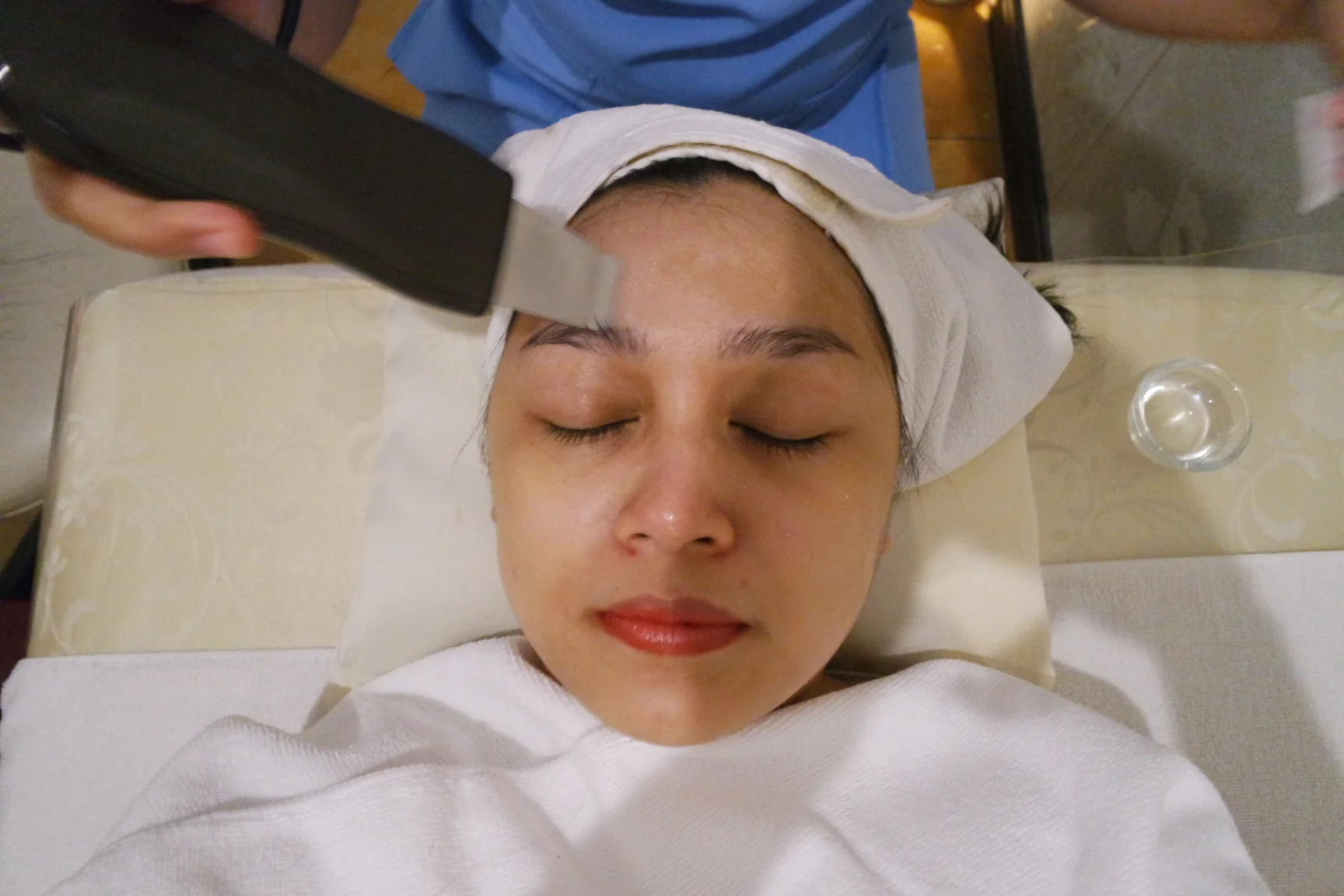 After a quick wipe off, my facialist showed me the flat, wide metal scrubber tip that would be used to deep-cleanse my pores. It looks a little intimidating but actually feels really pleasant! From what I understand, it uses water and ultrasonic technology to gently exfoliate your skin.