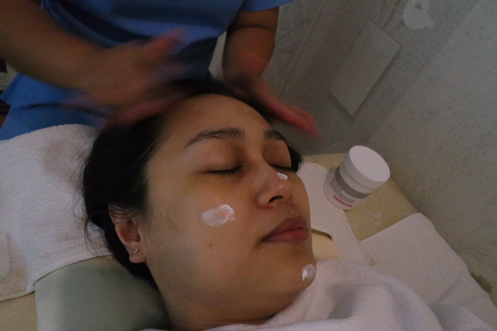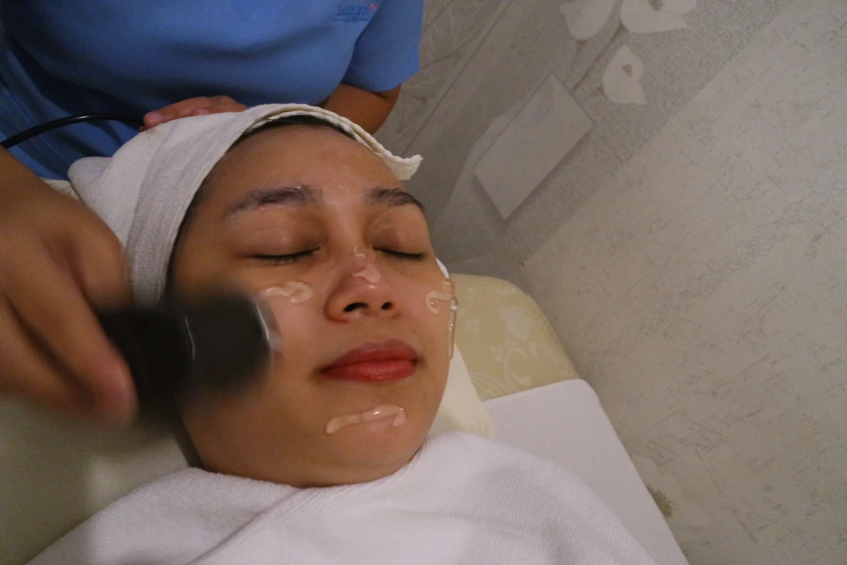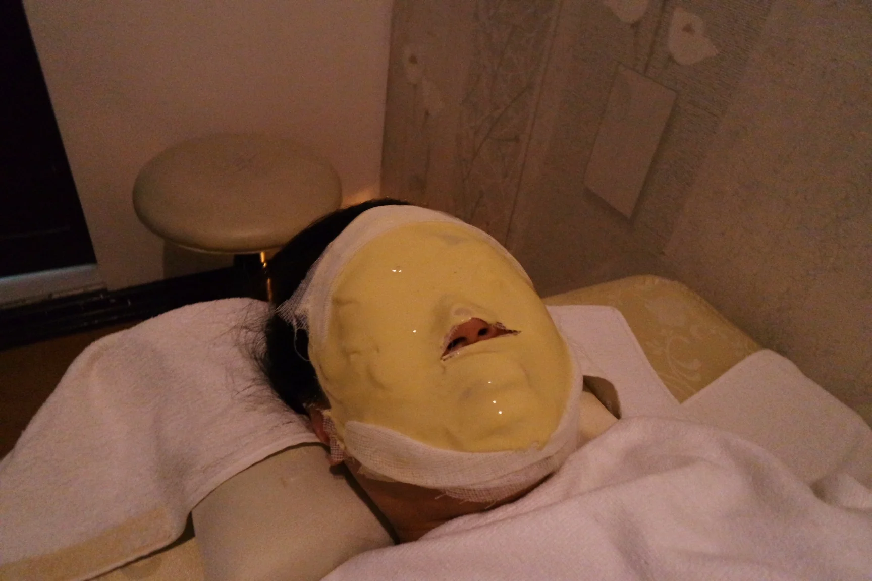 The electric shock woke me up from my post-massage drowsiness so we were back to calming my skin with an anti-aging cold collagen mask. A layer of gauze was placed on my face and cotton pads on my eyes before the attendant slathered a thick layer of mask all placed all over.