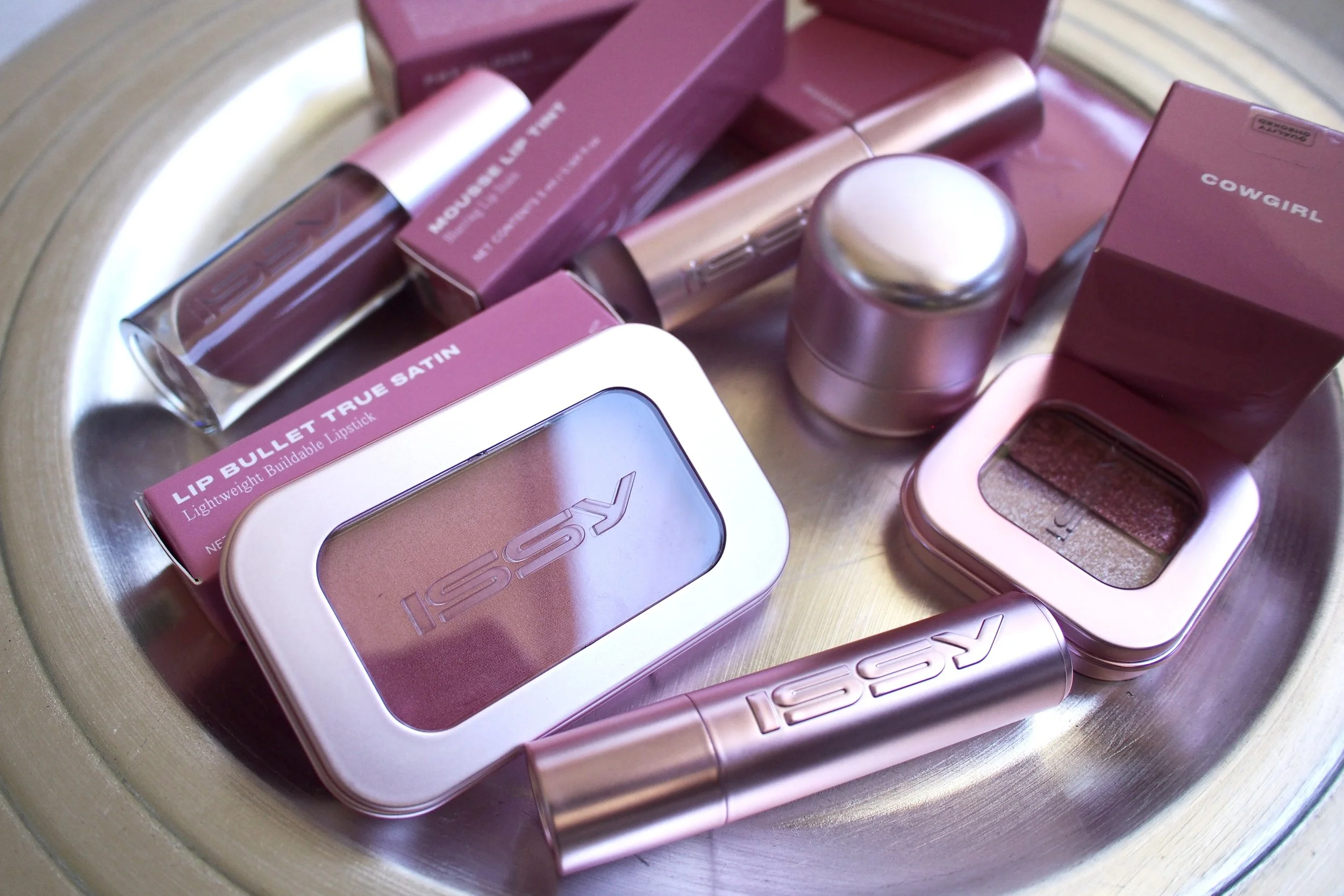 Swatches from L-R: Issy Cowgirl Eyeshadow Duo Nanopalette in Cowgirl and Reverse, Issy Cowgirl Powder Blush Micropalette, Issy Cowgirl Crème Flush Stick, Issy Cowgirl Lip Bullet True Satin, Issy Cowgirl Mousse Lip Tint, Issy Cowgirl Fat Gloss