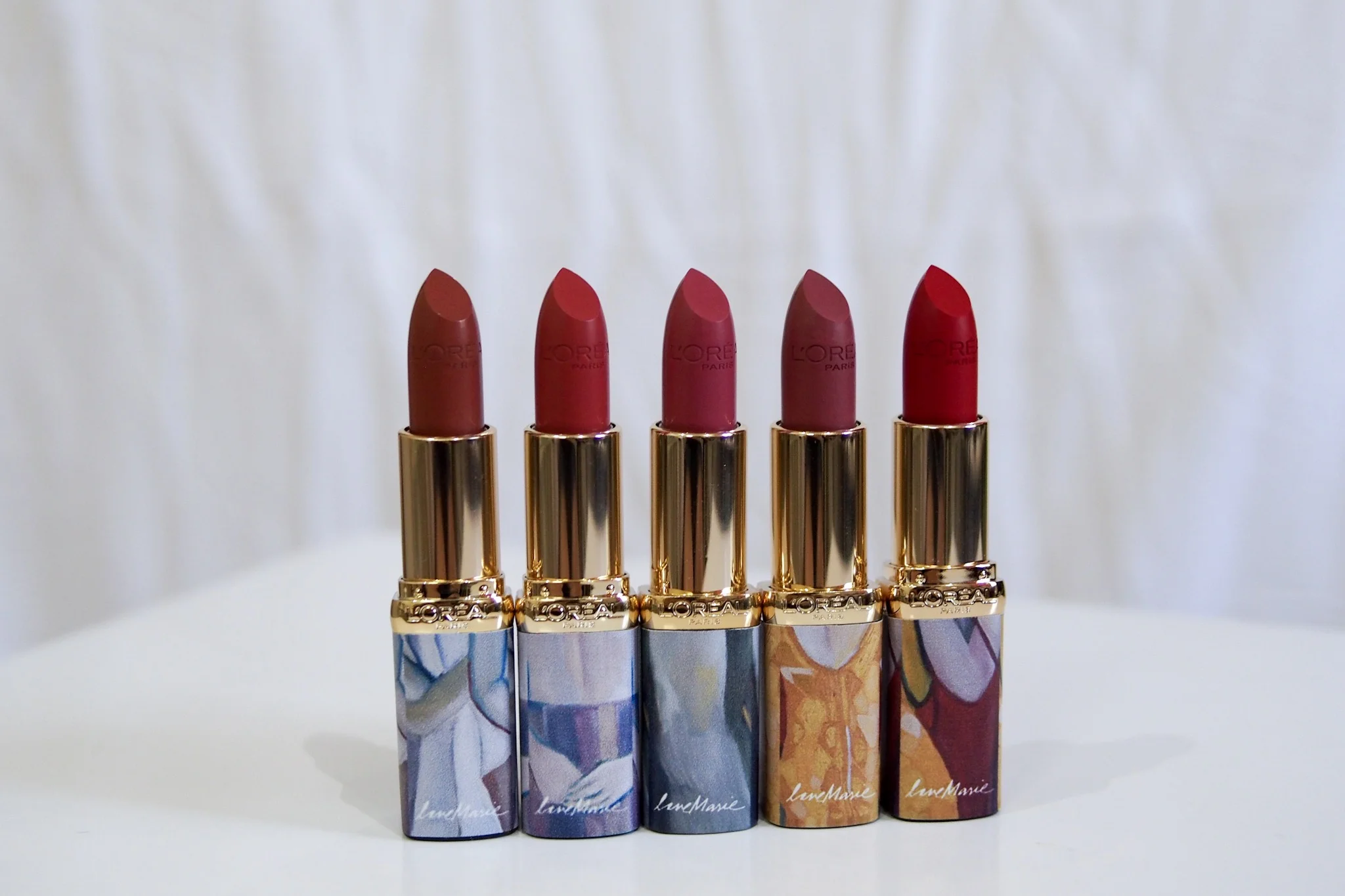 The packaging of the lipsticks is what sets it apart from the other L’Oreal Color Riche Mattes. While the original Color Riche features a faux leather finish for the plastic tubes, these 5 lipsticks have stickers wrapped around the tubes with Love Marie’s artwork and signature. If you complete all 5 shades, you can display them side by side and have a semblance of the painting!