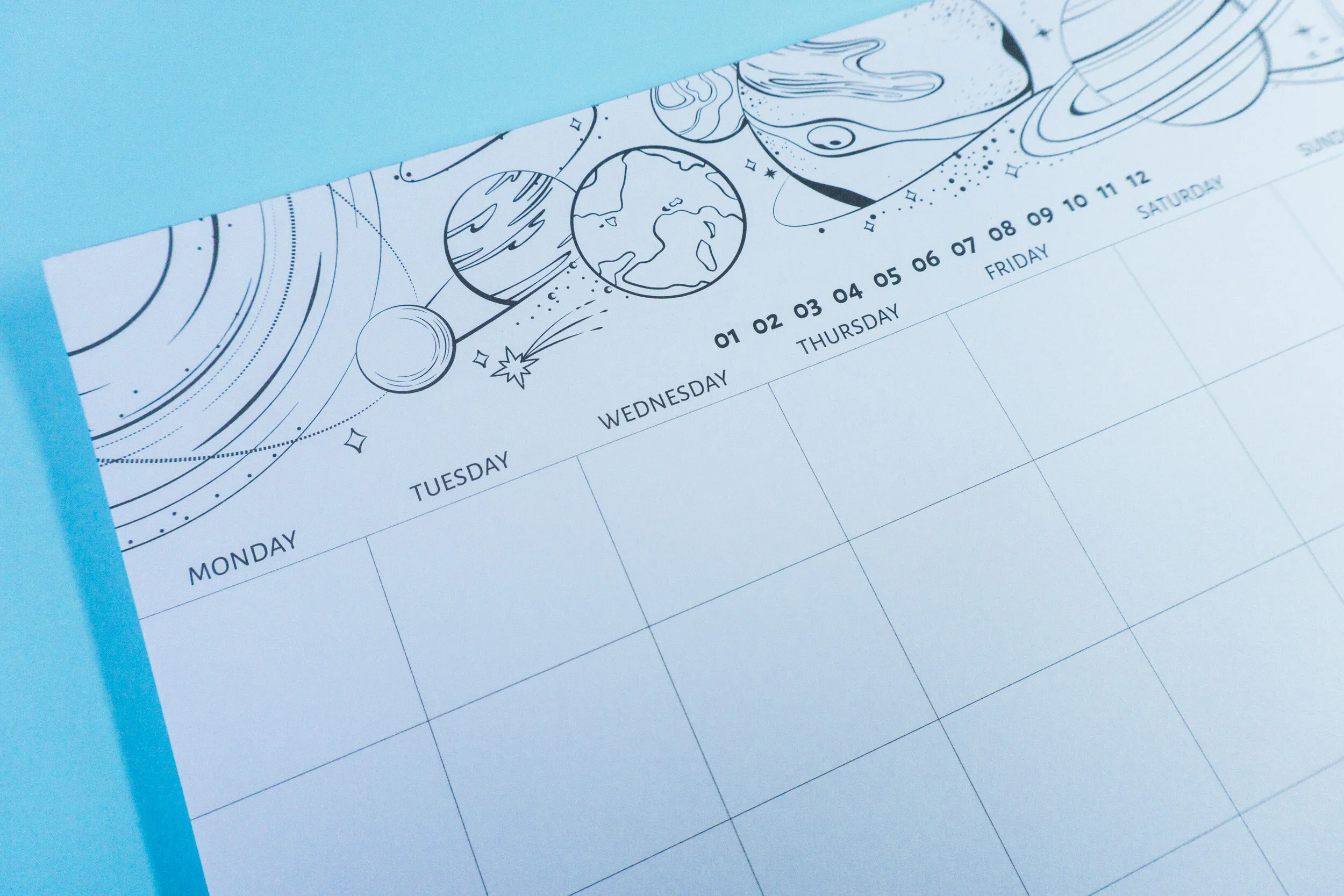 Finally, we come to my favorite in the collection: the Calendar Pad (P250)! “Out of sight is out of mind” can sometimes ring true for me, so I like being able to see my schedule on constant display. The galaxy design is also meant to be colored in, which is perfect for encouraging creativity. I already have this one up on the board above my desk!