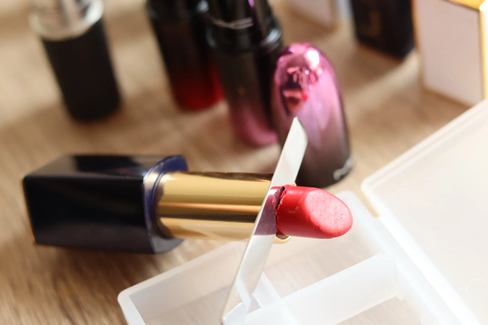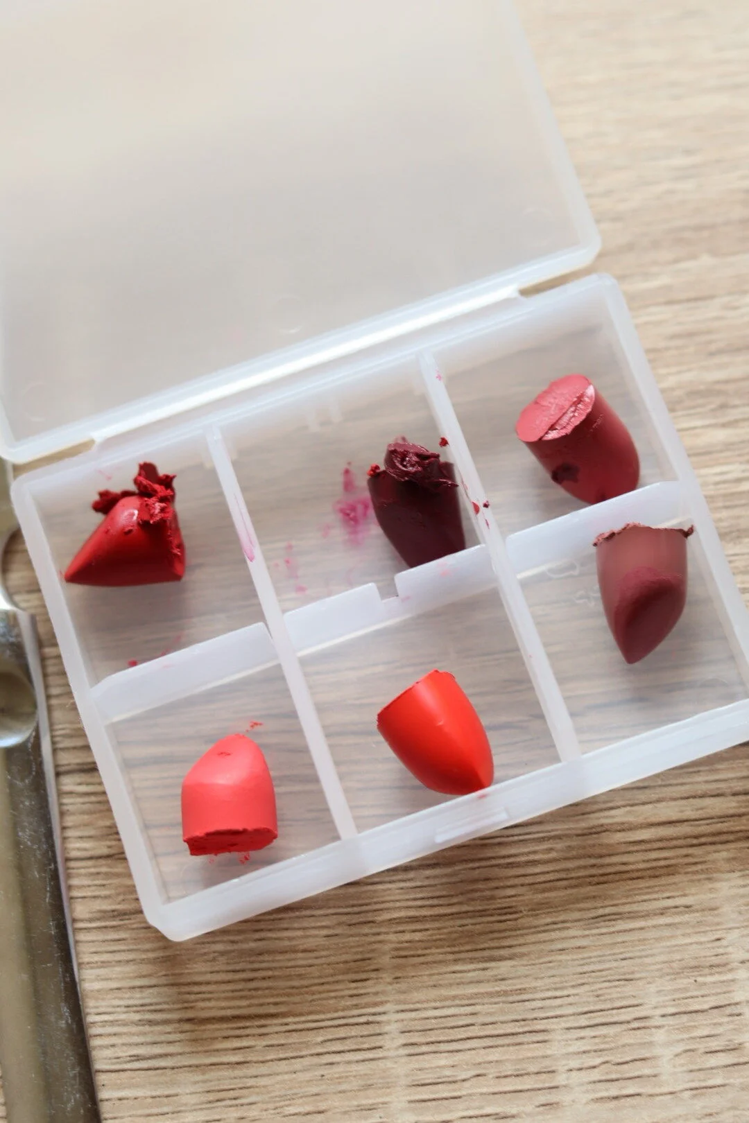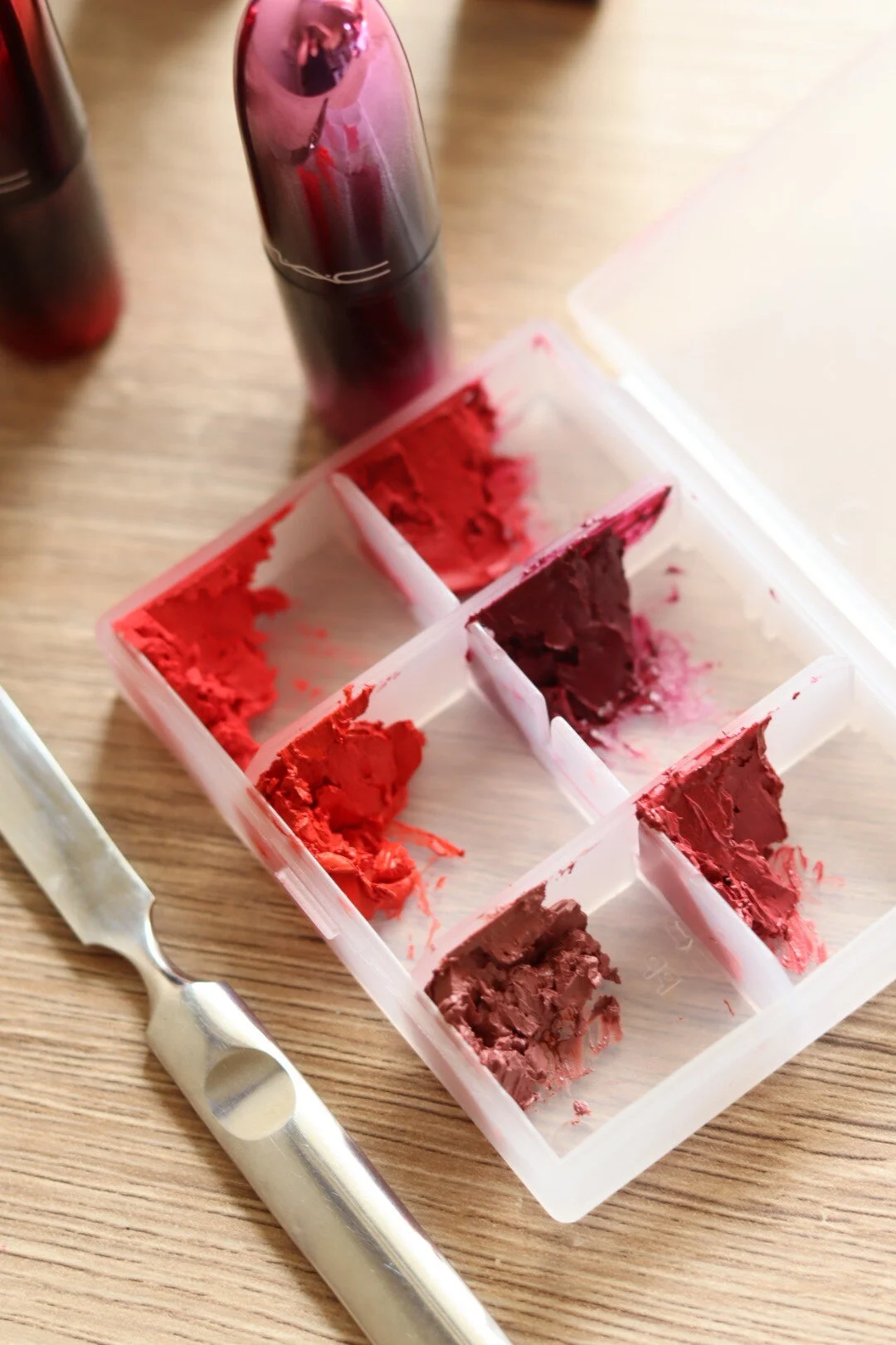 Cut or scrape the product with your spatula or knife. Really get in there. Lipsticks always have an extra one gram of product (that’s A LOT) in the very bottom of the tube, so you want to get all of that extra stuff out! Place it in the pan of the pill box then squish it down. You don’t have to do this and it can get messy BUT it’s easier to get the product with a brush this way, as opposed to keeping the molded tip pristine.