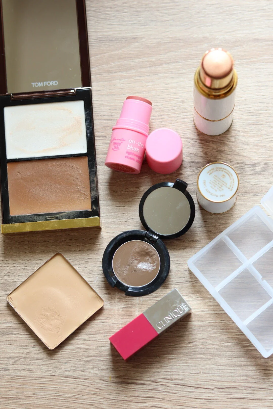 Cream products you want to put in the palette. Could be lipsticks, foundations, concealer, blush, eyebrow gel - anything that won’t dry out in a pan. Eyebrow gels or eyeliners that dry fast when exposed to air are a no go here. You want something that stays emollient.
