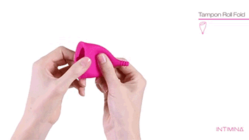 Aside from finding a folding technique that suits you best, you also have to be in a comfortable position that makes insertion easier, just like when you put on a tampon. You can squat down, put one leg up the toilet seat, or just sit down. The important thing is that you’re in a comfortable position that allows you to relax, which is honestly even more important than the fold or the position.
