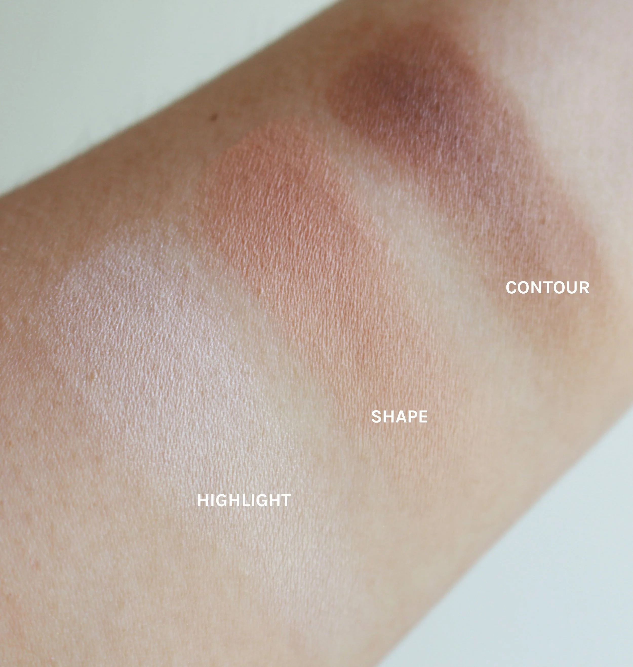 - The Shape shade in the middle is a bit lighter and closer to my skin tone. It's a nice color to use if you just want a more natural definition. It's a more forgiving color than the Contour! It doesn't seem to last as long though, at around 3-4 hours of wear. Maybe because it's not as easy to spot as the contour?