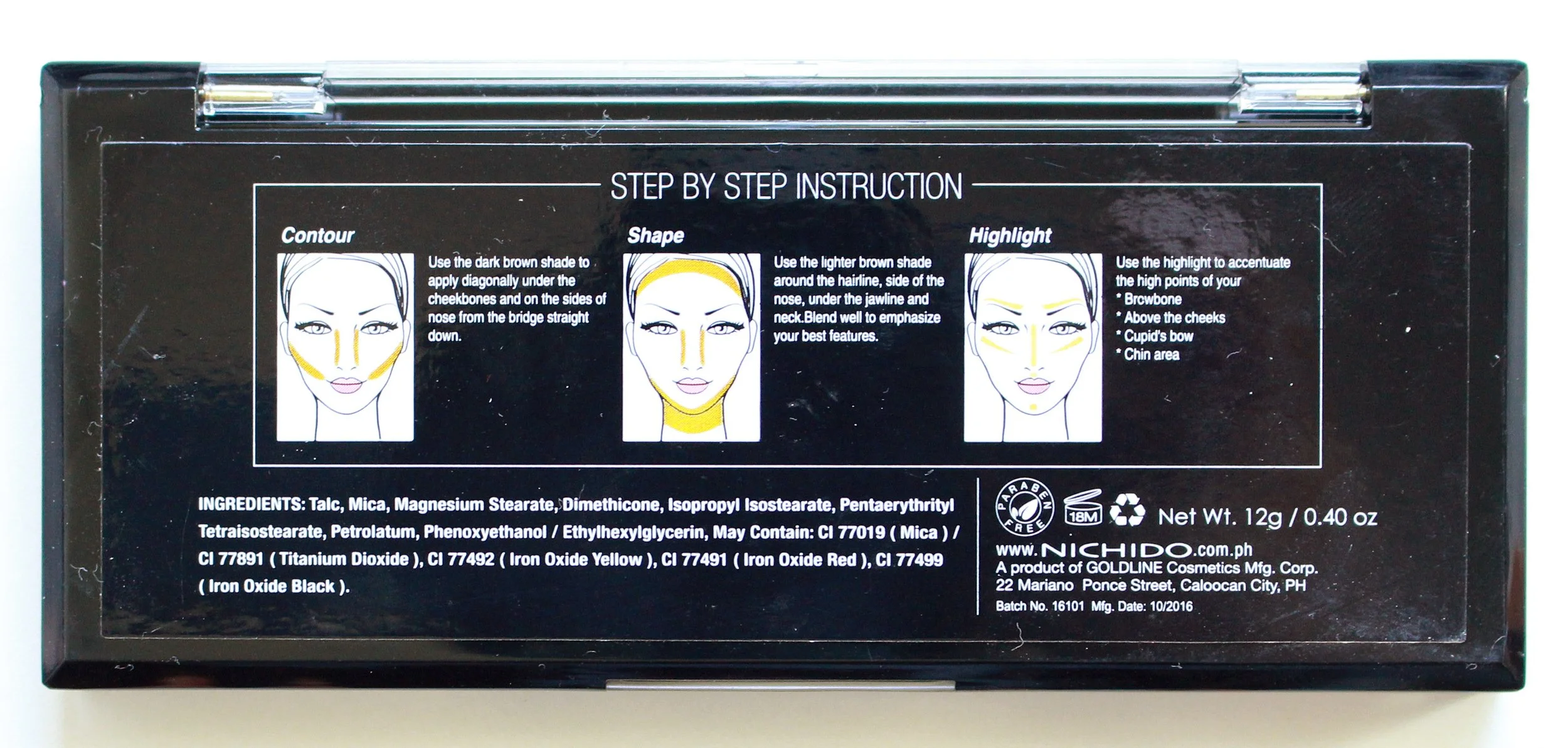 I picked this up while I was shopping for tissue and wipes at Watsons. I actually put it back because it was a bit expensive for a Nichido product, but I thought I'd live a little. At P348, the Nichido Contour Palette is probably one of the pricier items from the brand. It contains a matte higlighter, a shading color, and a contour color.
