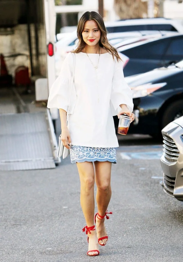Having to deal with the crazy rush-hour traffic is stressful enough, so you shouldn’t let choosing clothes stress you more! Light tops are perfect if you want to feel comfortable without the hassle. Jamie Chung's top with bell sleeves looks great with a pencil skirt for channeling that Girl Boss vibe without the hot power suit. Trade the strappy heels for close-toed pumps though to keep it workplace-friendly.