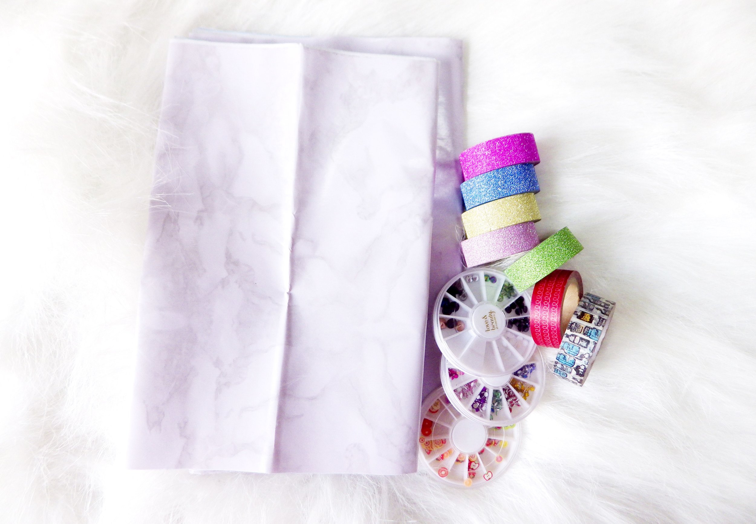 I chose a simple marble covering for my old but well-loved Nordstrom palette because it reminds me of the Hourglass Surreal Light palette. For the Covergirl Cheekers blush, I went for a PV pink vibe using glittery washi tapes in two shades of pink.