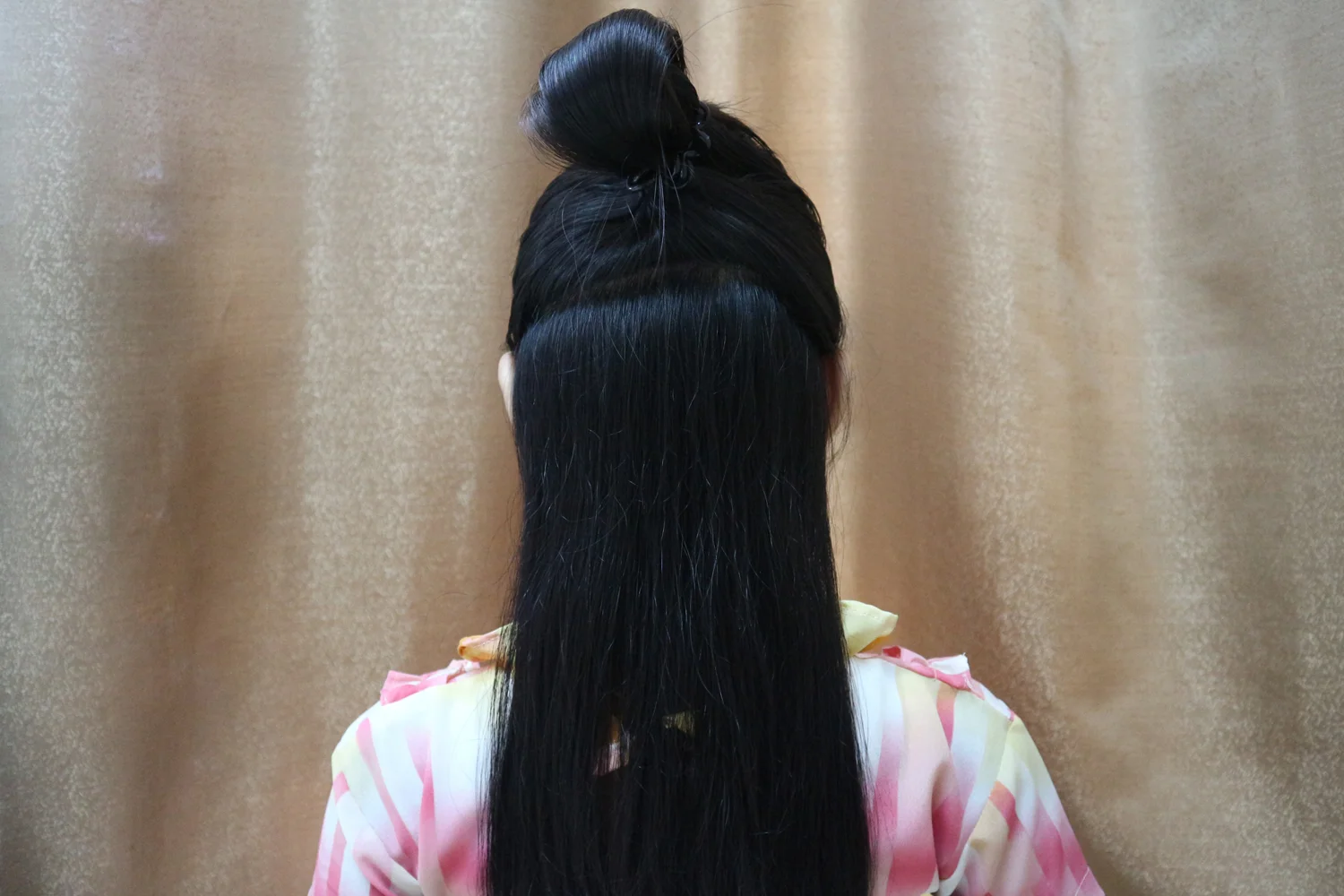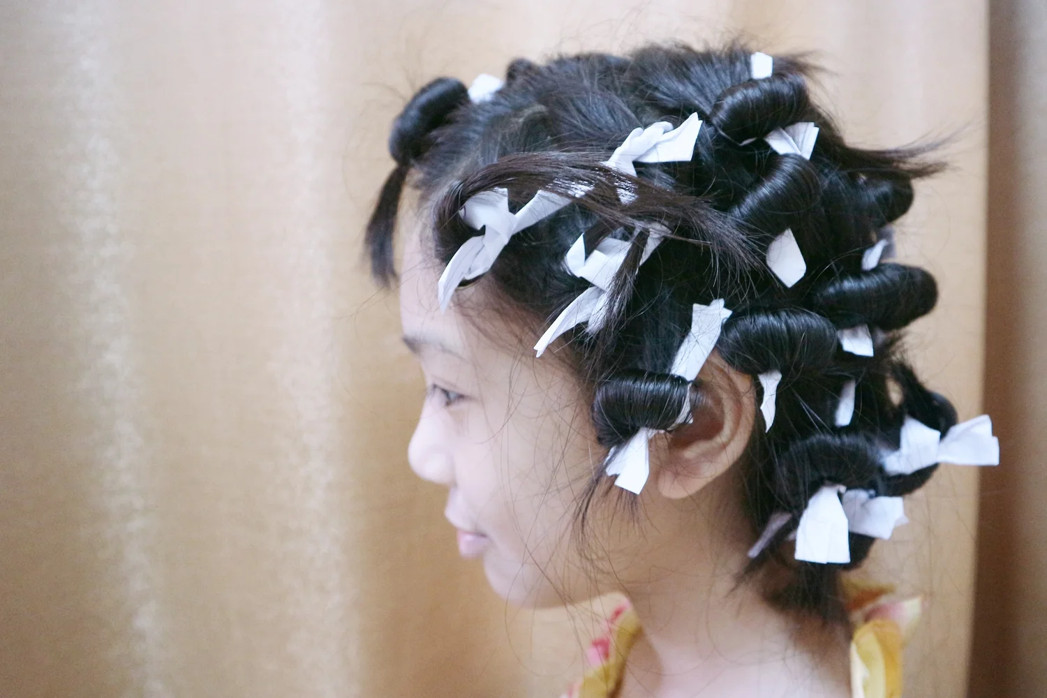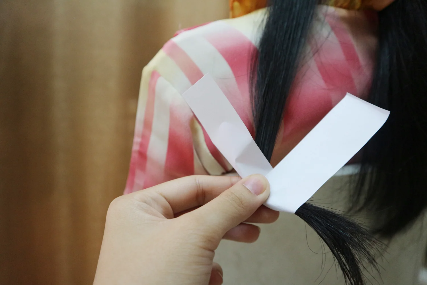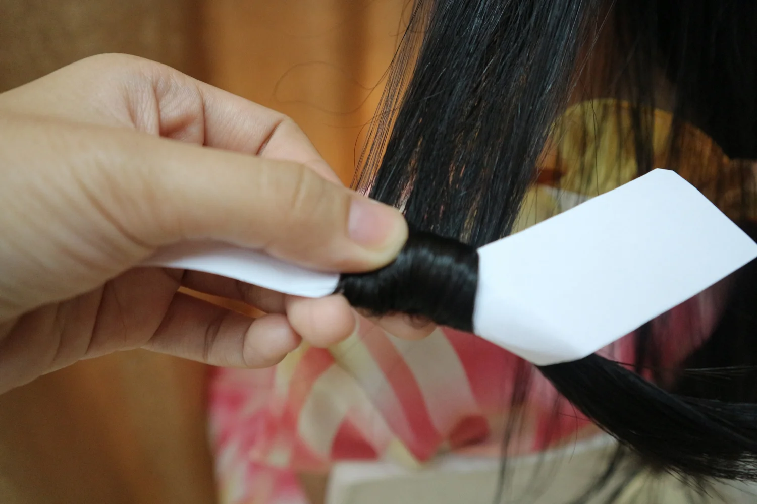 Step 2: Take a little section of hair and wrap it with the strip of paper to make a V-shape. Roll the hair around the middle of the V until you get to the roots. Take both ends of the paper strip and tie a knot. This is how it should look like when it’s done.
